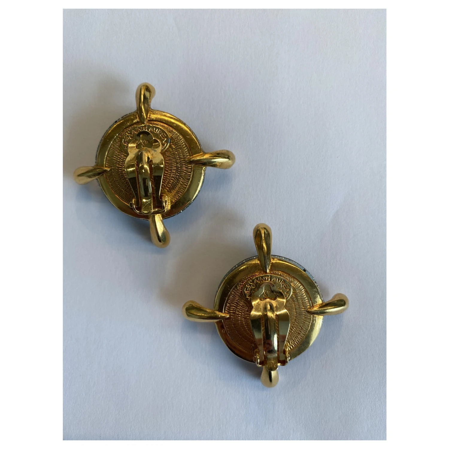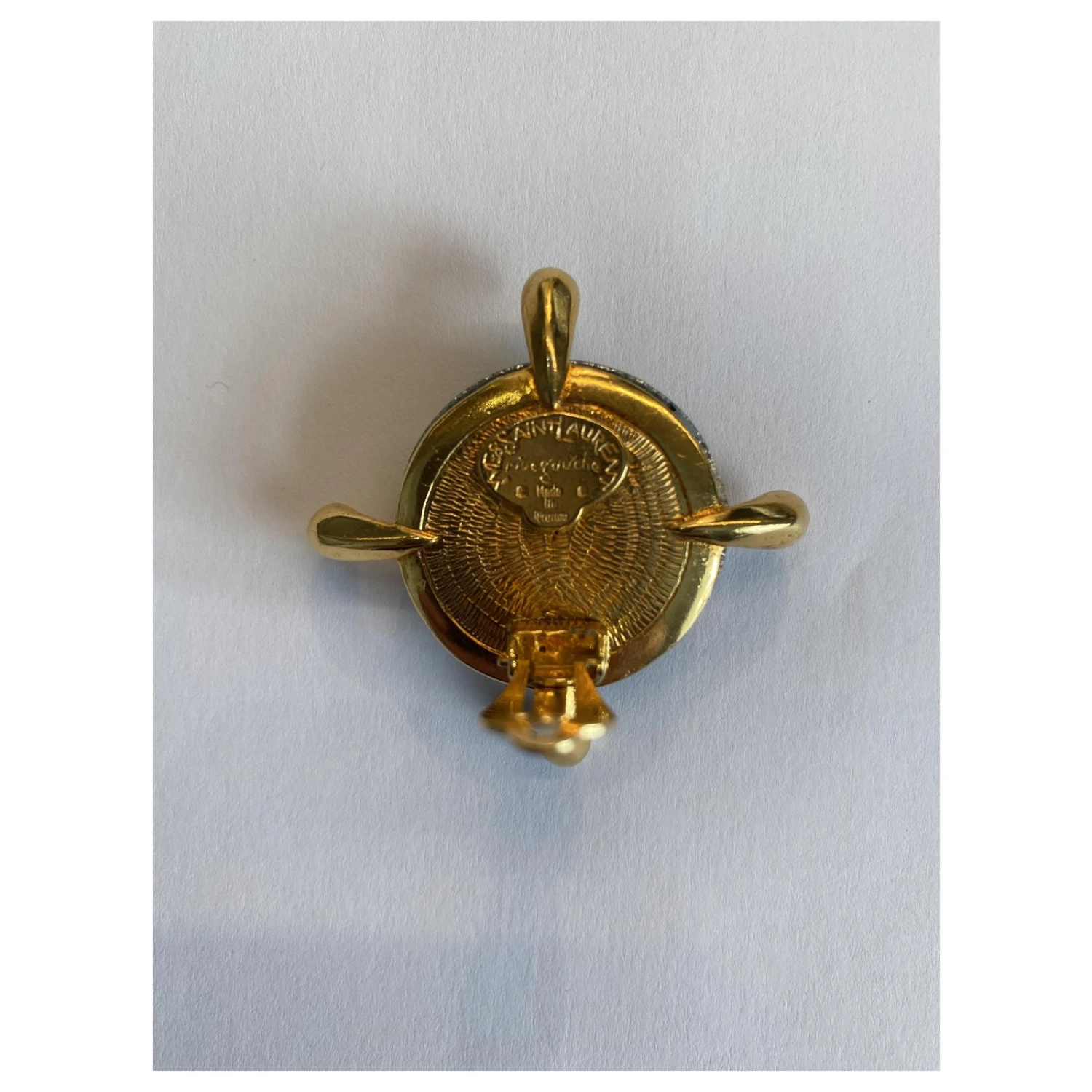 Boucles d’oreilles clip Yves Saint Laurent Rive Gauche en métal doré cabochon en verre de couleur vert émeraude. Diamètre du cabochon 3cm.