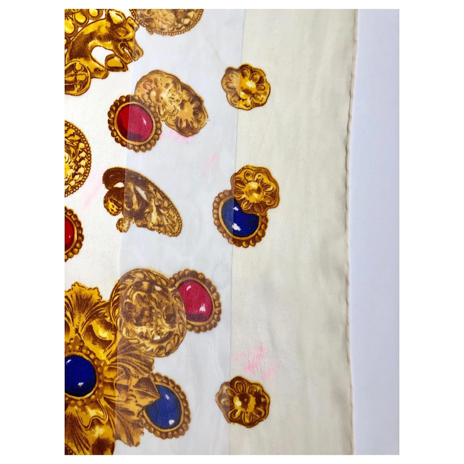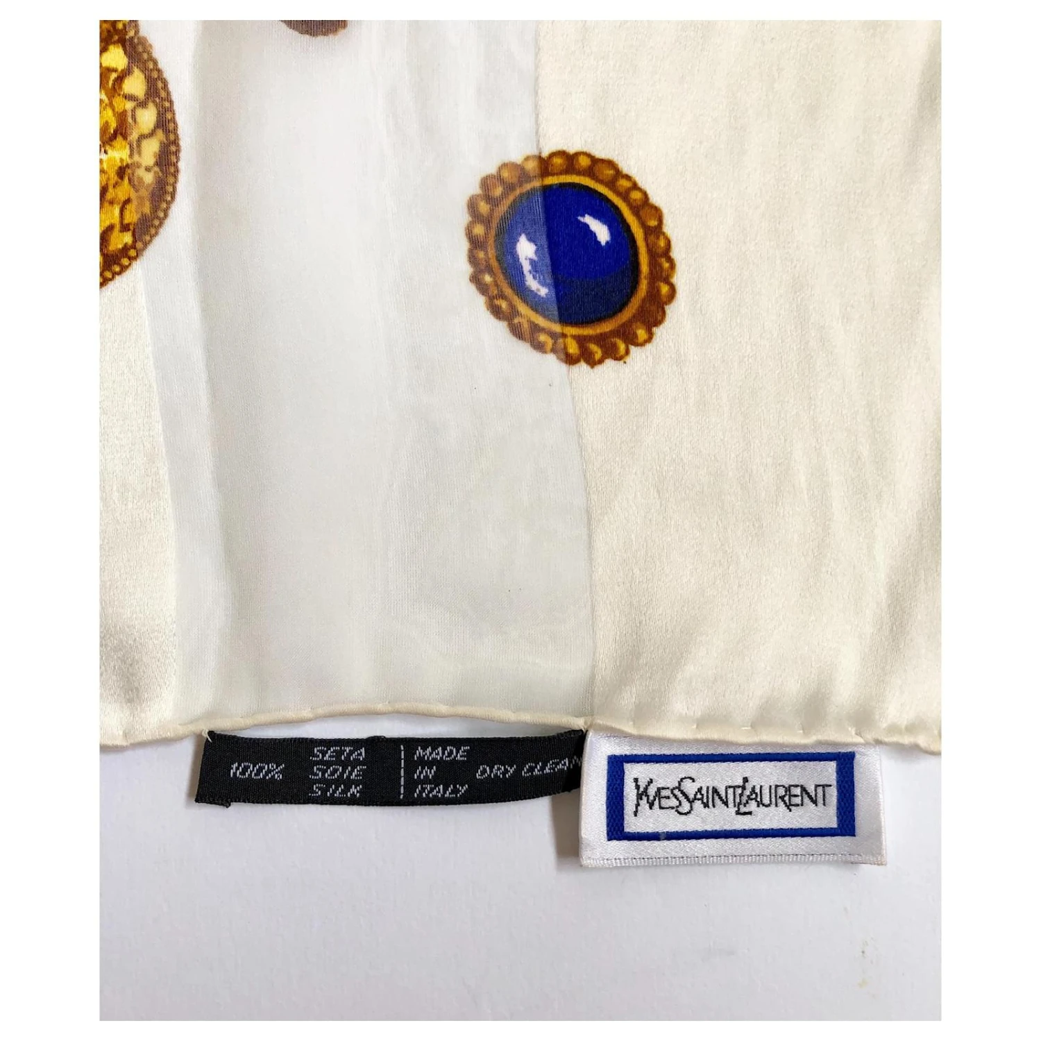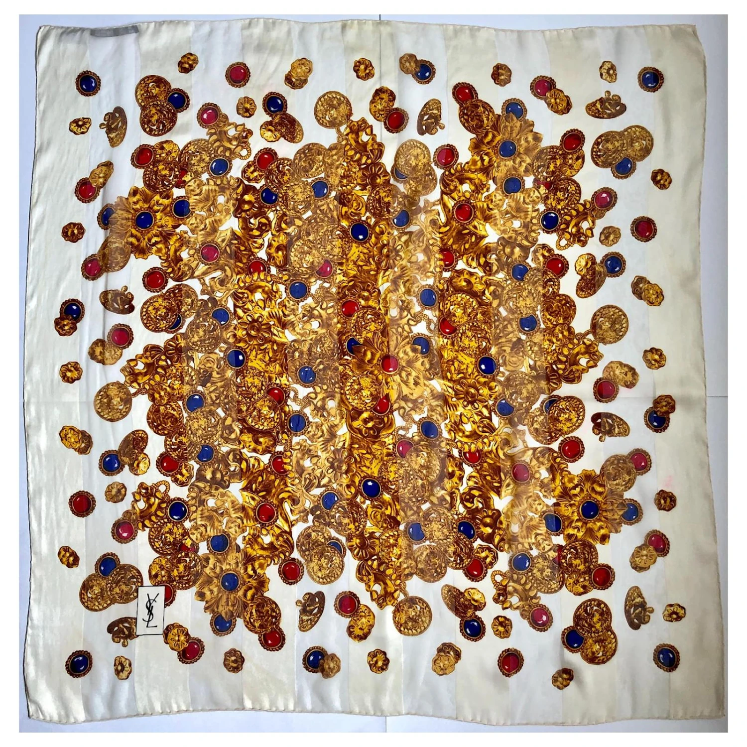 Foulard en soie entièrement imprimé vintage Yves Saint Laurent bijoux en beige, Gold, couleur rouge et bleu profond. 100% silk.