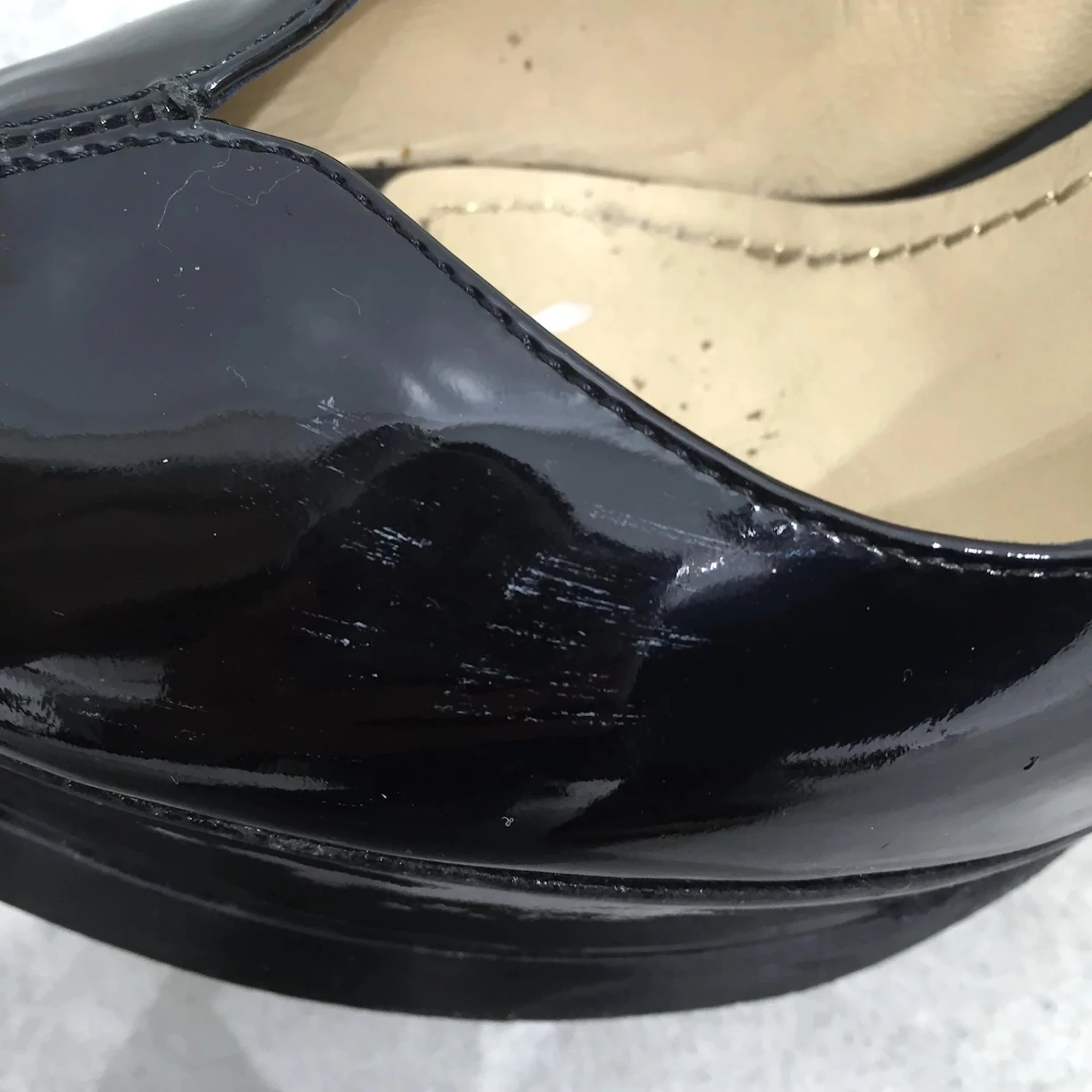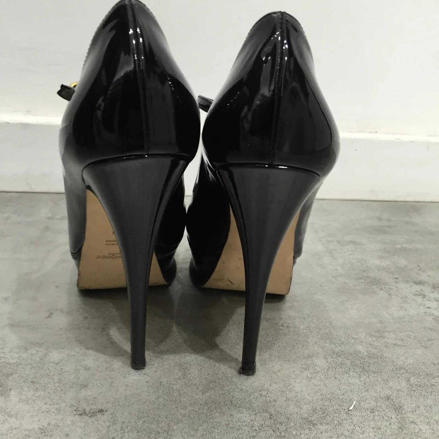 Escarpins vernis noir à plateforme, bride de cheville et extrémités ouvertes.