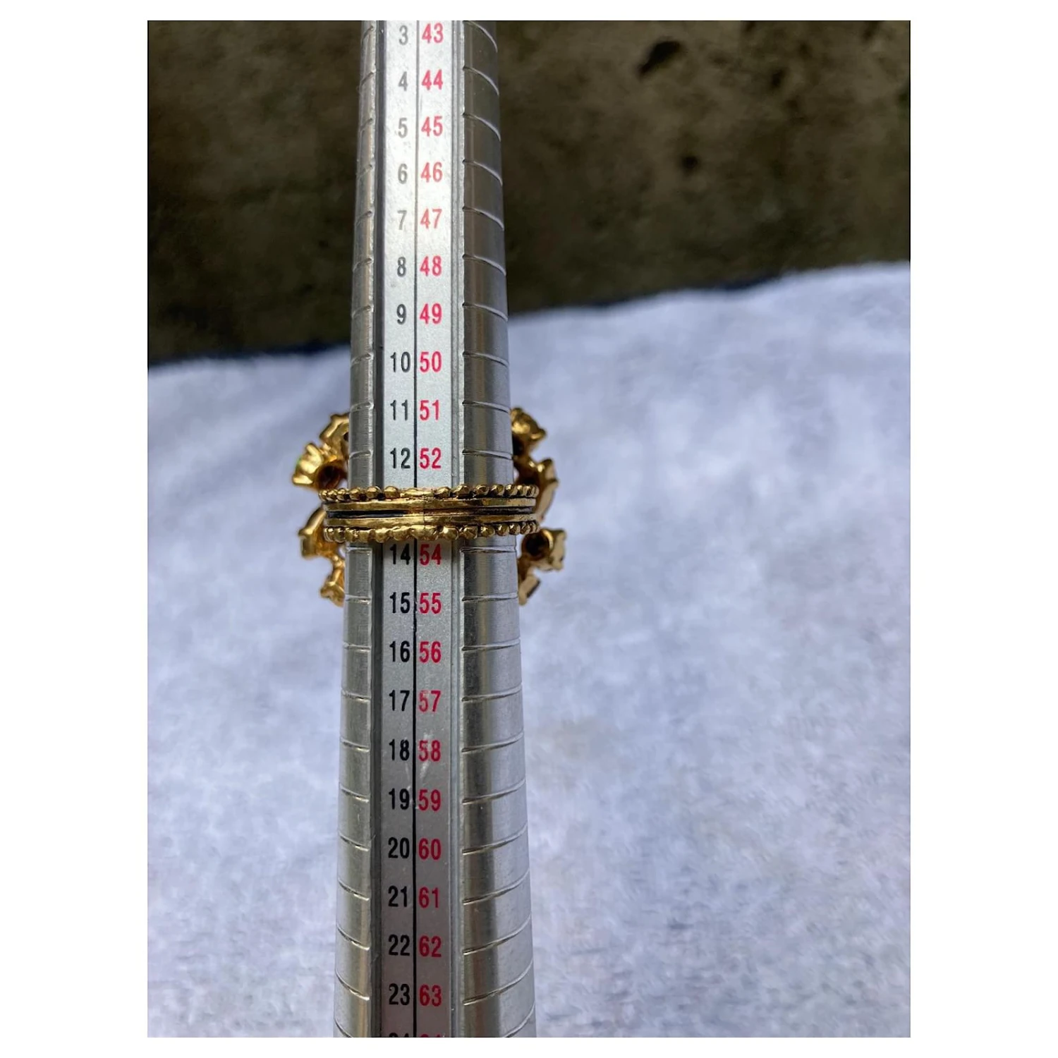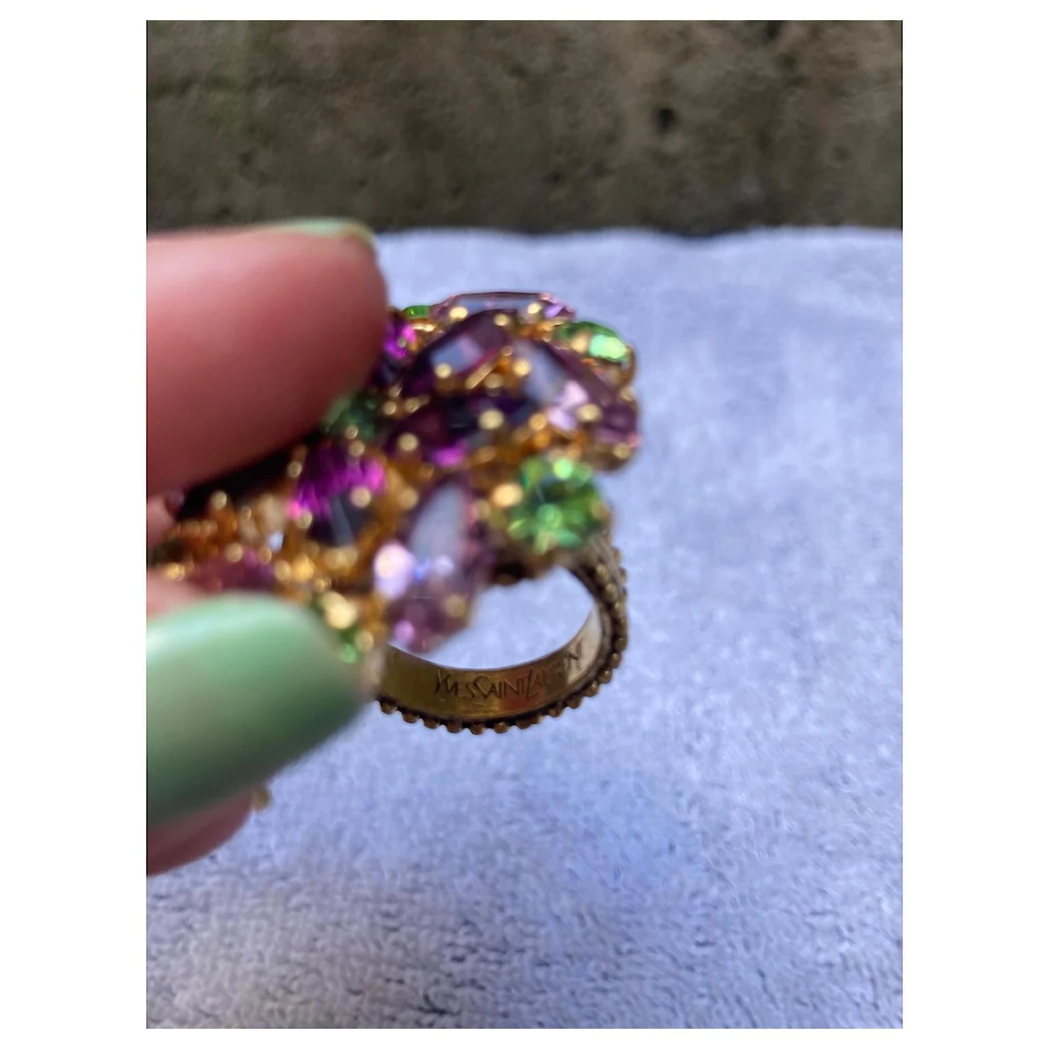Sublime bague Yves Saint Laurent avec incrustation de pierre en verre cabochon violets et vert. Montés sur bague en acier dorée et travaillée sur tout le pourtour.