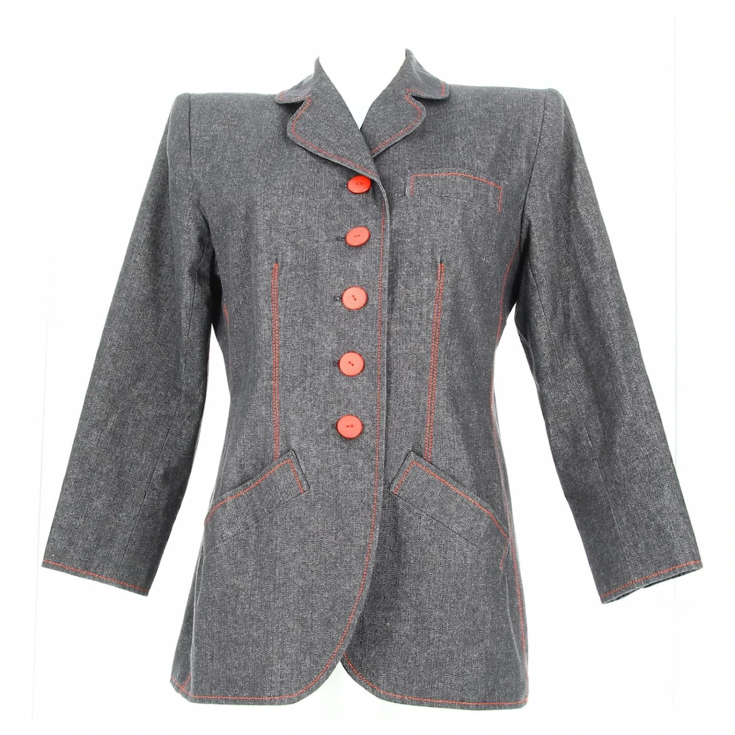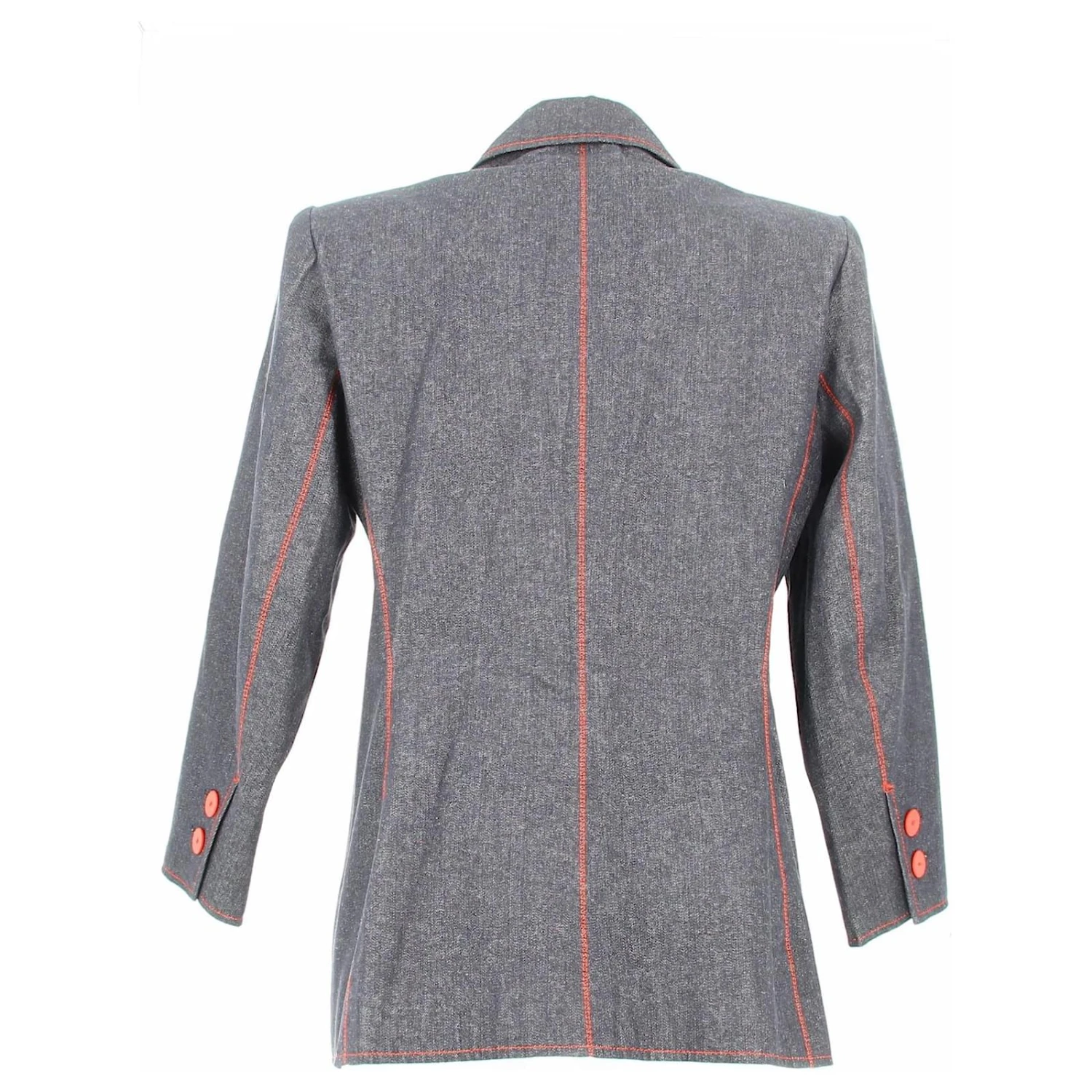 Veste en jean grise Yves Saint Laurent avec boutons rouges. A porter de jour comme de nuit, qui apporte une touche plus élégante à votre tenue.