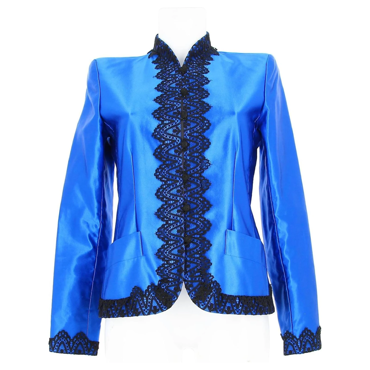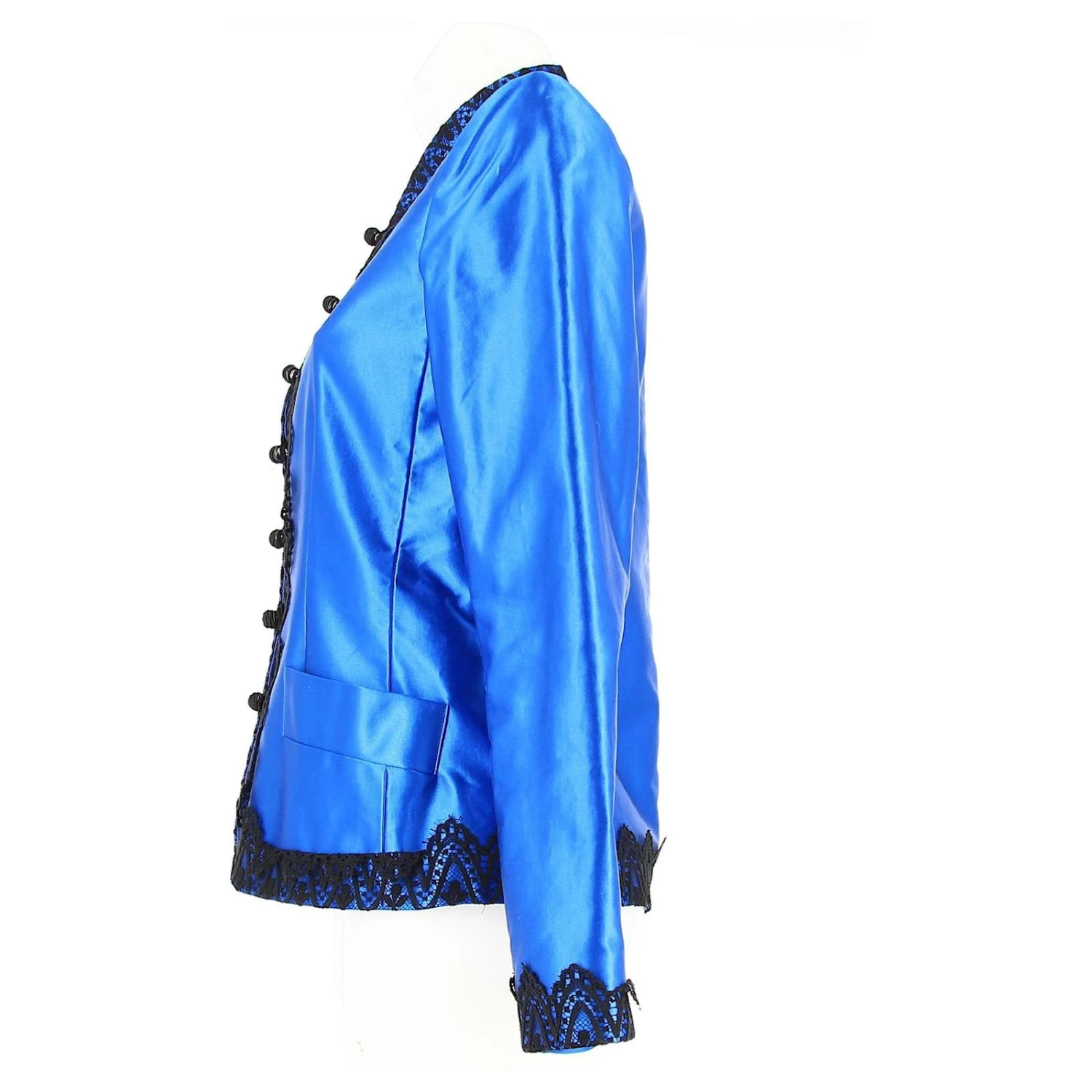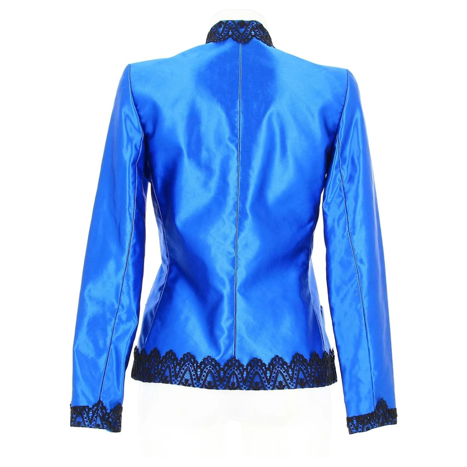 La veste est en satin bleu, avec de la dentelle noire tout autour, qui ajoute une touche plus féminine à la pièce.