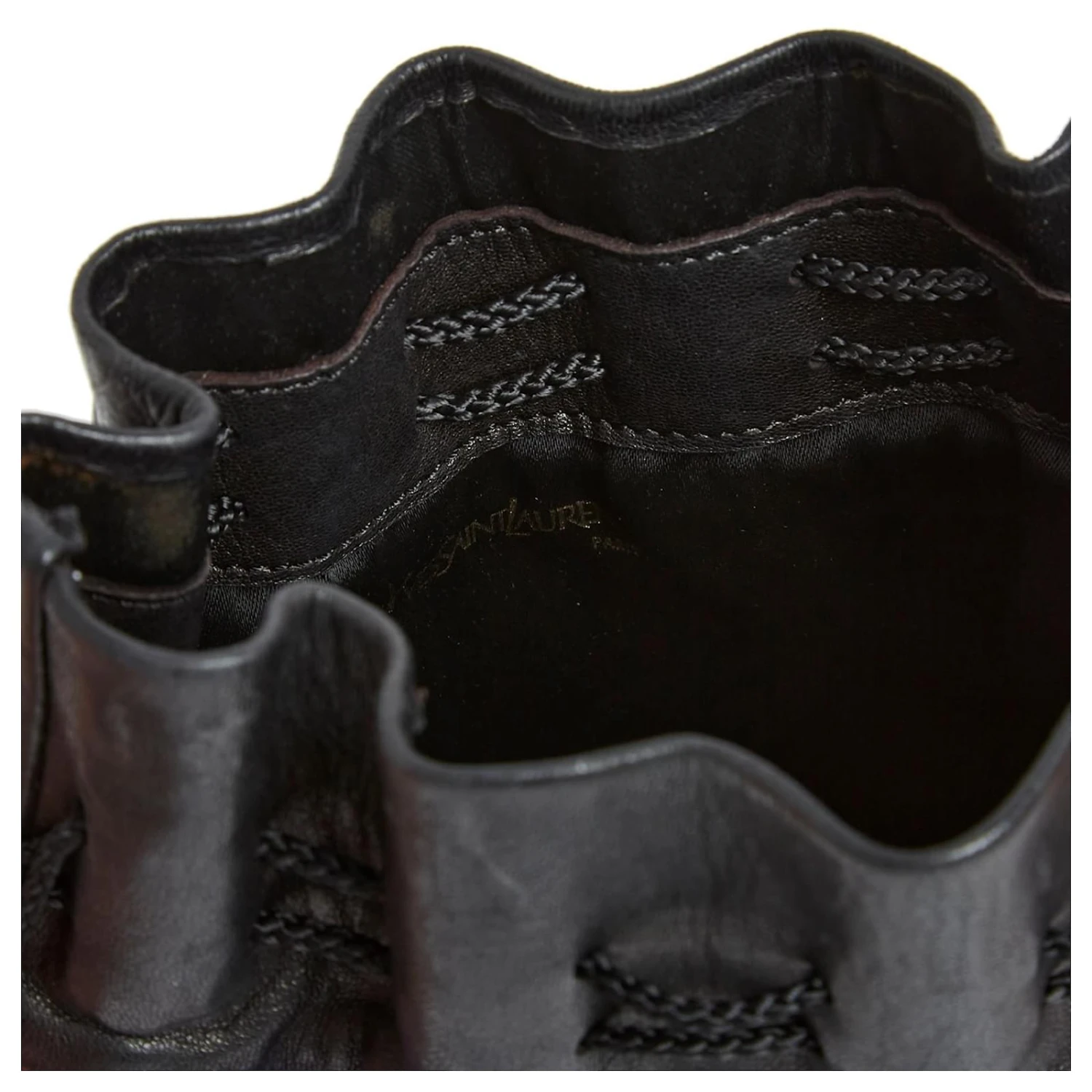 Sac Yves Saint Laurent années 1970 en cuir et velours noir et multicolore à motif de rayures et pompons sur passementerie, intérieur en satin noir refermé par ses 2 longues anses ornées de pompons de cuir également. Largeur 22 cm x hauteur 20 cm x profondeur 1 cm (vide), anses 150 cm. Le sac est bien vintage et il présente quelques traces de son âge mais il reste en très bon état, intérieur propre, cuir souple, velours vif et propre, et c’est une pièce rare …