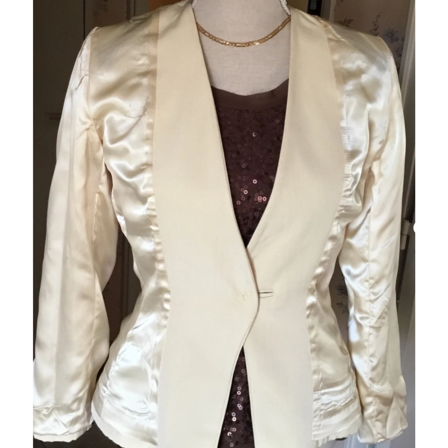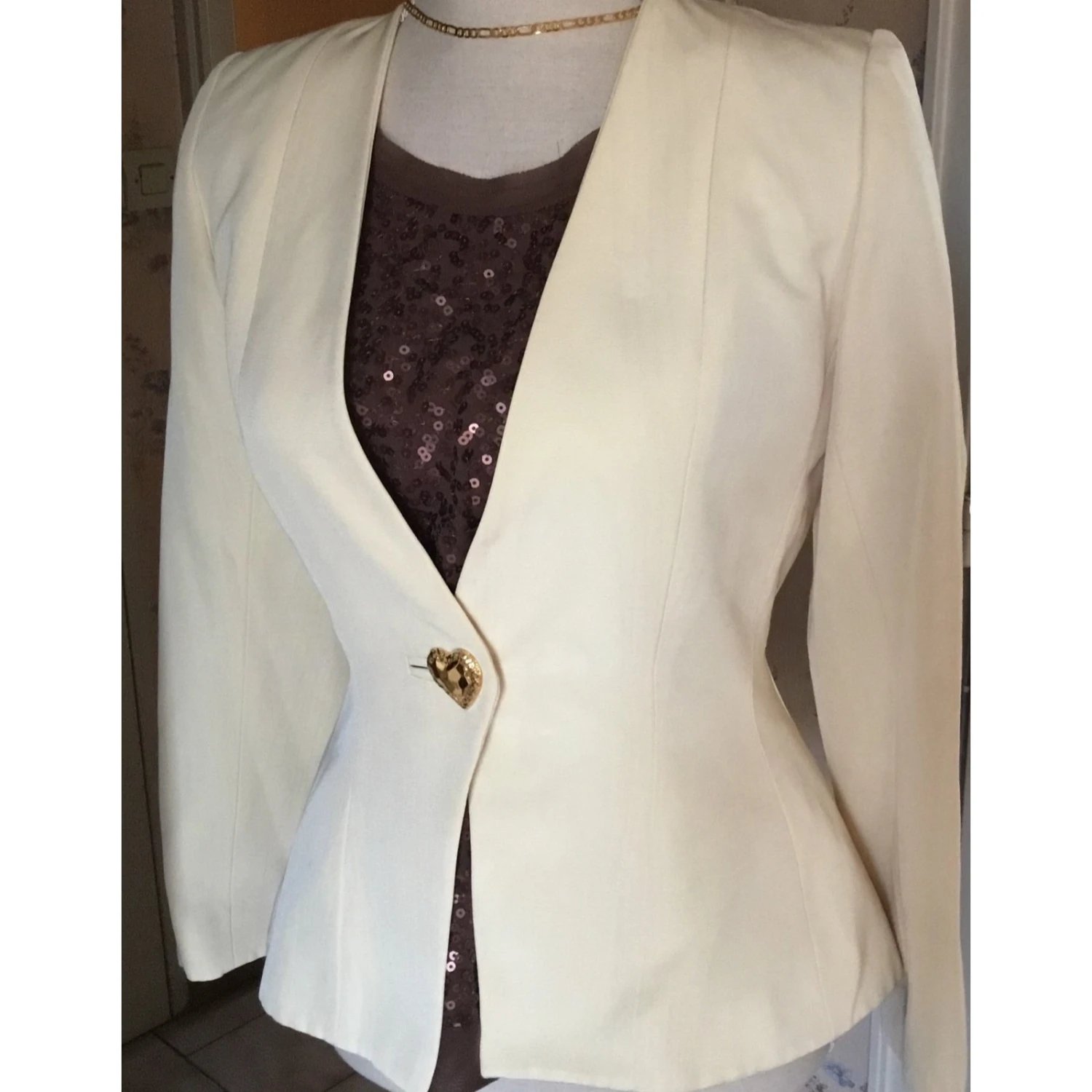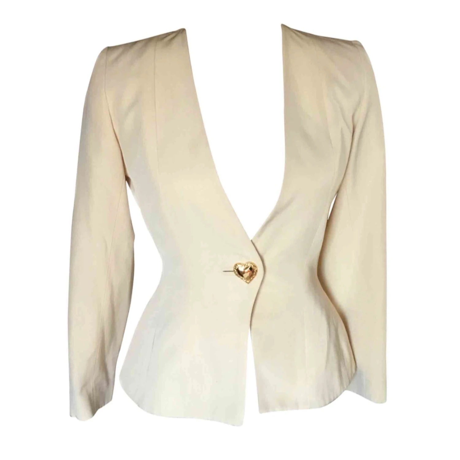 Sublissime blazer en tissus chiné écru de chez yves laurent – coupe cintrée et col en v – taille 38. Crée dans un tissus de très belle qualité et chyc. Il ferme avec un bouton doré en forme de coeur, élément vital pour yves saint laurent qui a toujours lutté pour embellir la femme. Le cœur c’est l’amour et ce blazer le reflète bien. Entièrement doublé de tissus de satin de haute qualité. Une pièce qui s’harmonise avec toutes les couleurs. Une pièce incontournable dans un dressing de femme. Mesdames n’hesitez plus