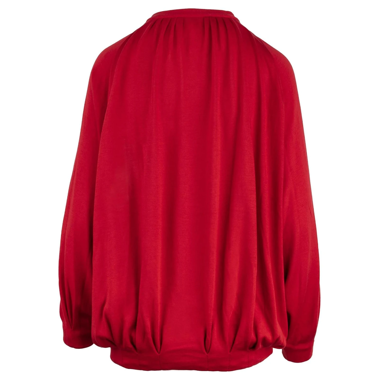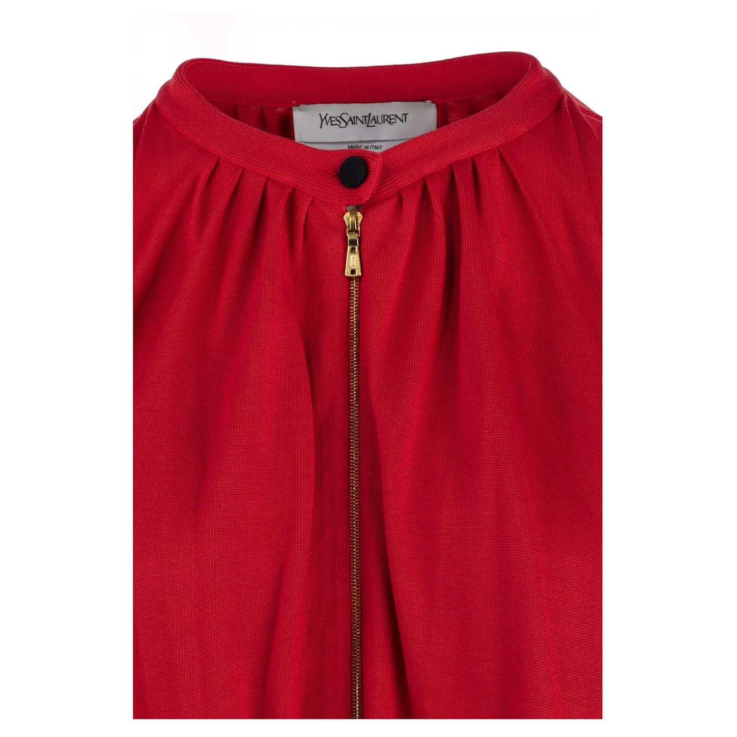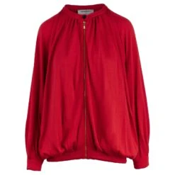 Bomber en soie et coton rouge Yves Saint Laurent, coupe oversizee avec manches larges, col rond orné d’un bouton noir et d’un zip central.