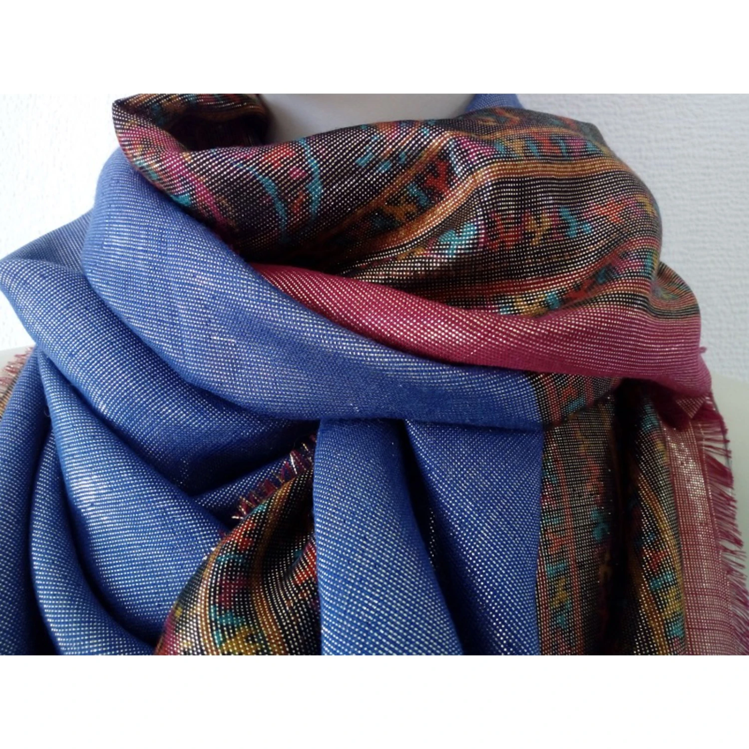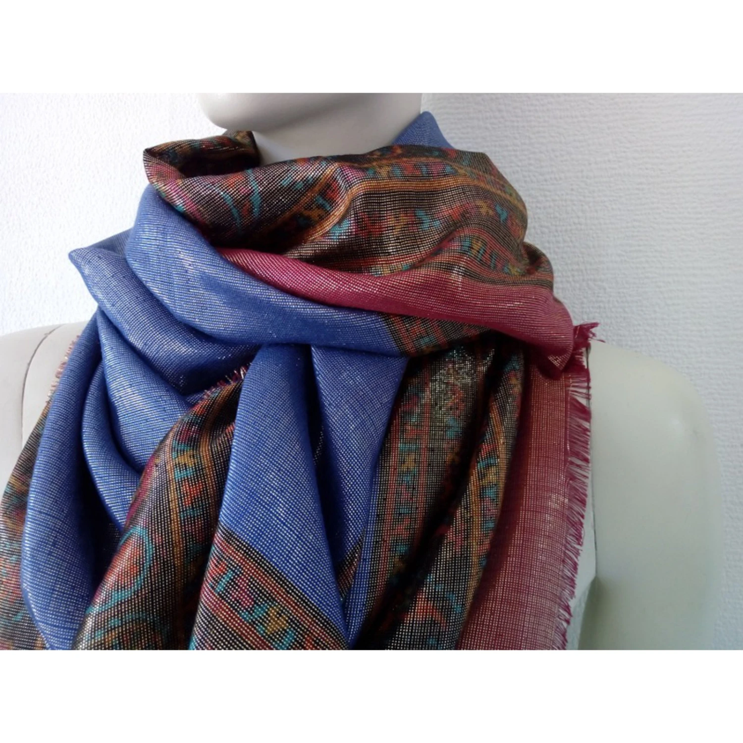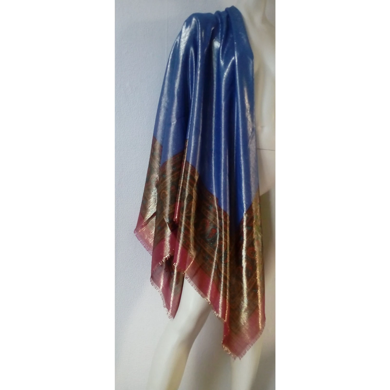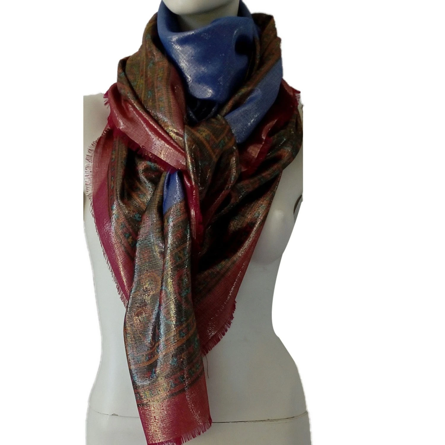 Châle YSL de fin des Années 70 peut-être de la Collection des Ballets Russes en soie et lurex . Je n’ai plus l’étiquette de composition il y a certainement aussi un peu de laine (mais je ne peux pas le dire à 100%)