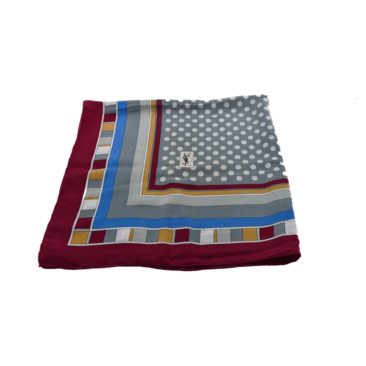 Superbe Carré Vintage en soie de la maison Yves Saint Laurent fabriqué en France qui se présente avec une couleur bordeaux dominante, des motifs géométriques colorés et un motif à petit pois blancs.