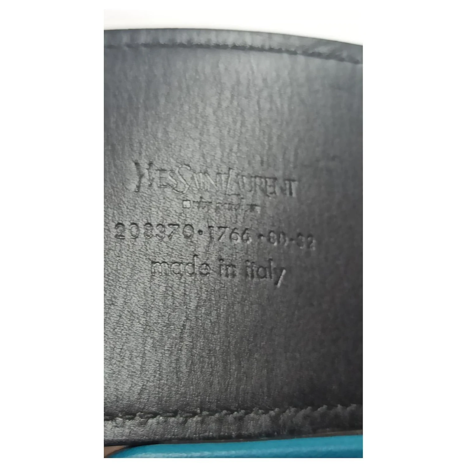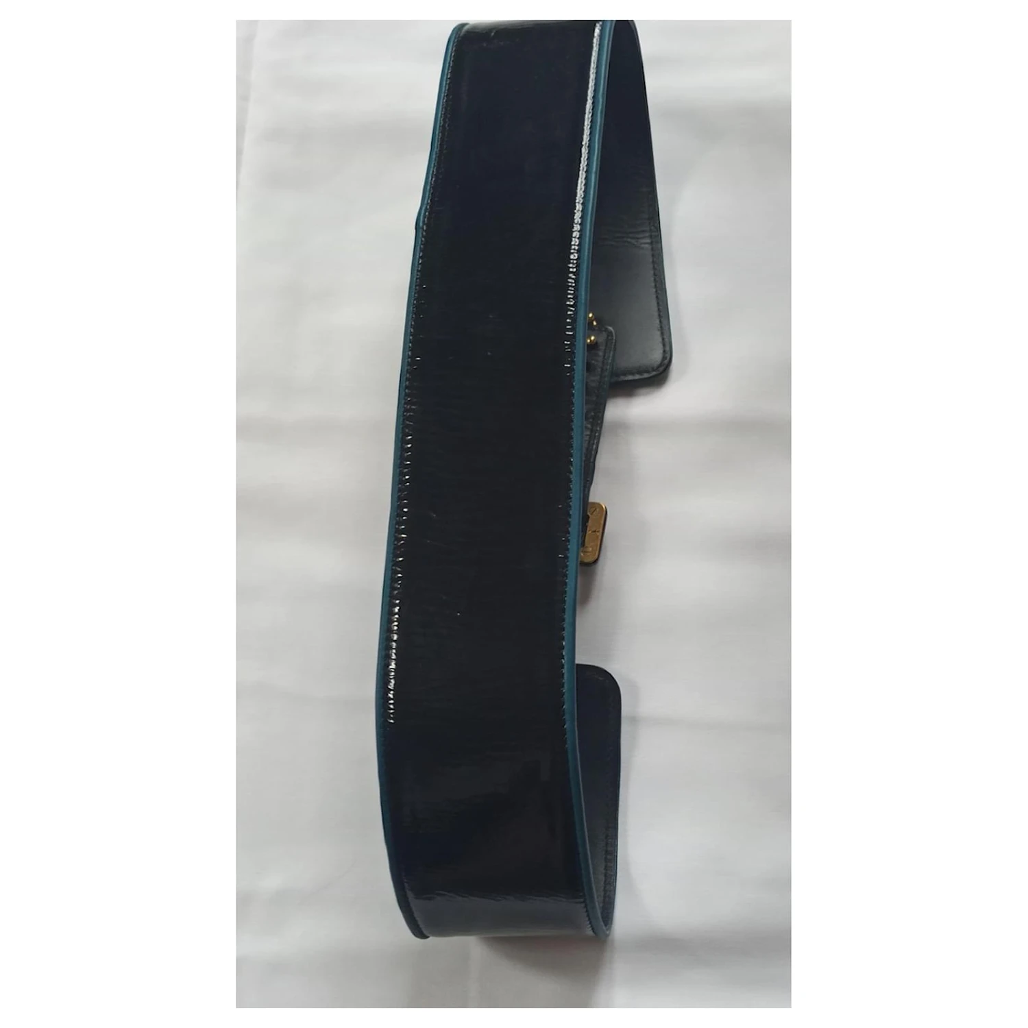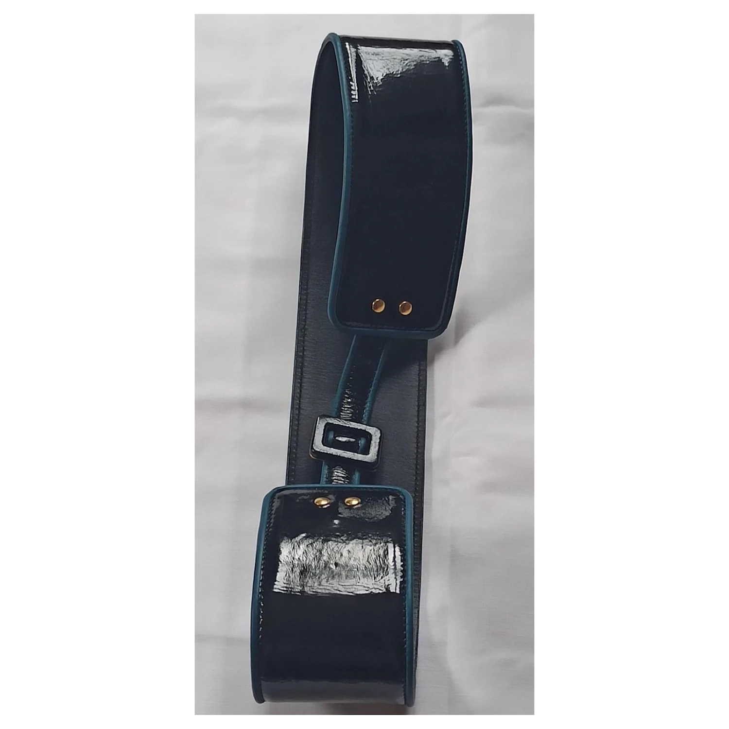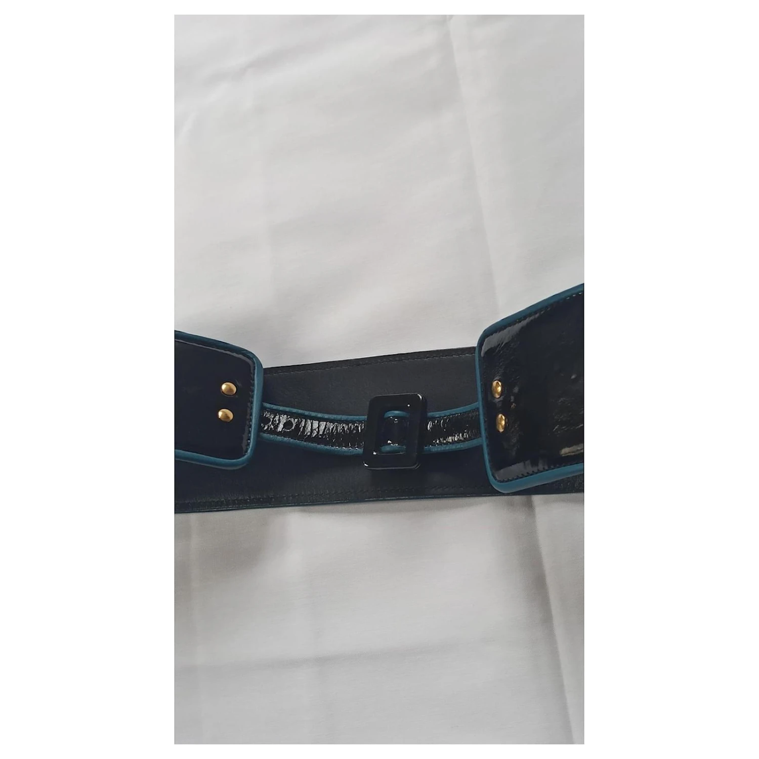 YSL ceinture large réglable à l’intérieur, en cuir vernis noir bordée en cuir bleu sarcelle. fermeture rectangle signé YSL.