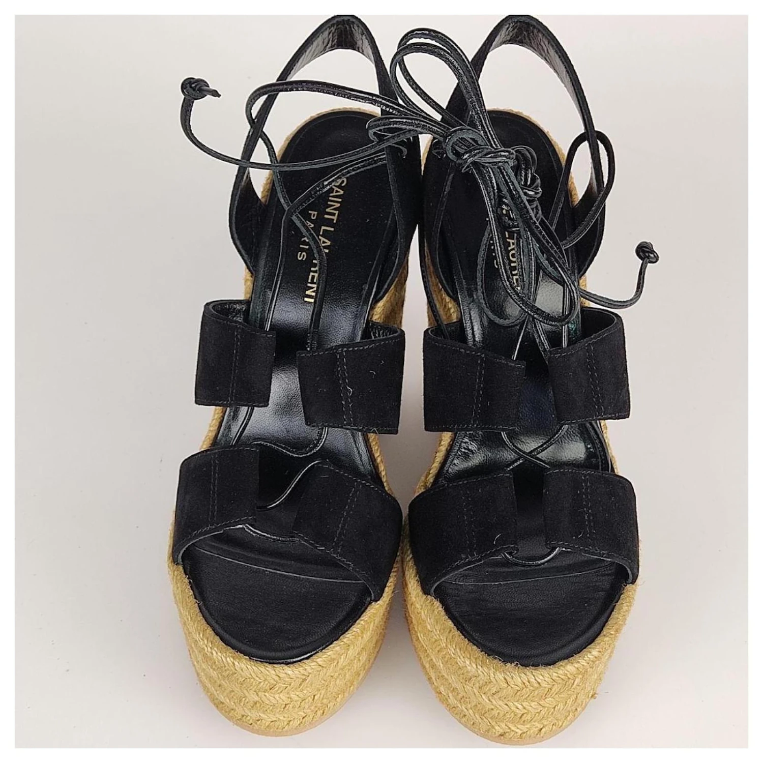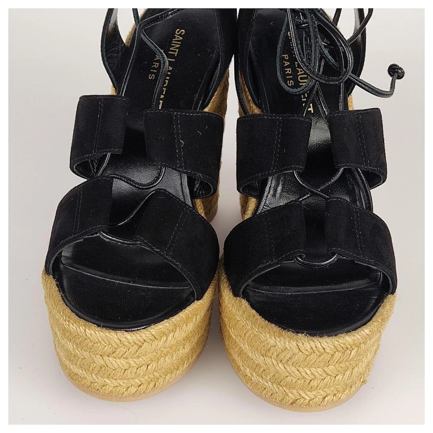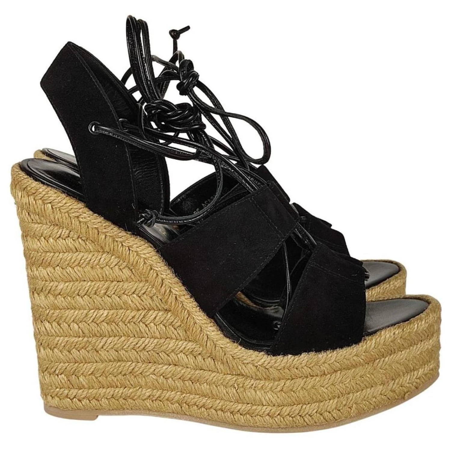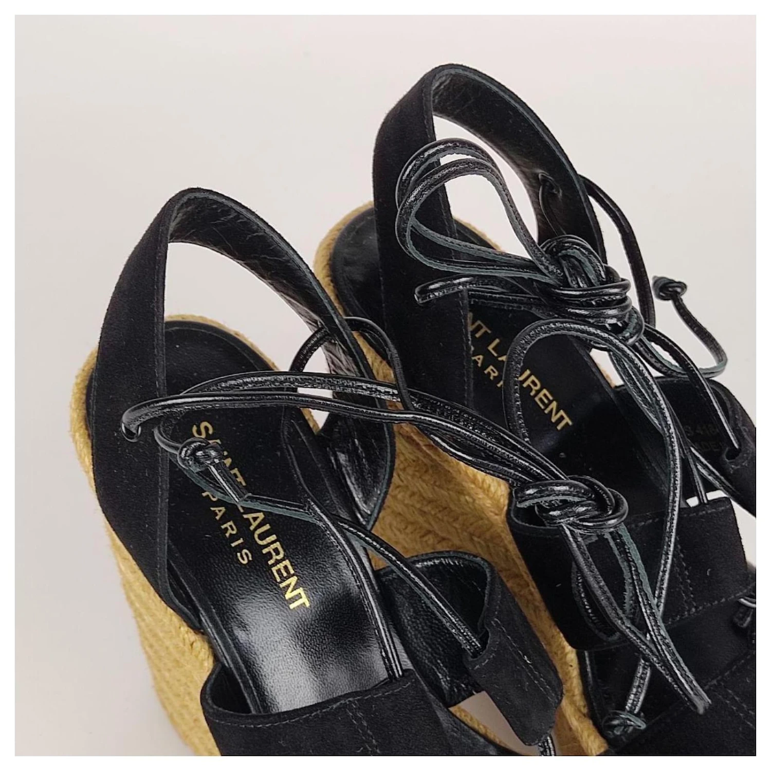Code: 4174A130marque: Saint LaurentMODÈLE: Sandale Slave avec talon compensé en suède pailleMADE IN: EspagneCARACTÉRISTIQUES: Sandale pour femme en daim noir et compensée en paille beige. Lacé à l’esclave sur le mollet. Intérieur en cuir et semelle en caoutchouc. Neuves avec boîte et dustbags.Couleur noireMATÉRIAU: DaimTAILLE: 38 MESURES: longueur de la semelle 21.5 cm, HAUTER 13.5 cmCONDITION: NEW