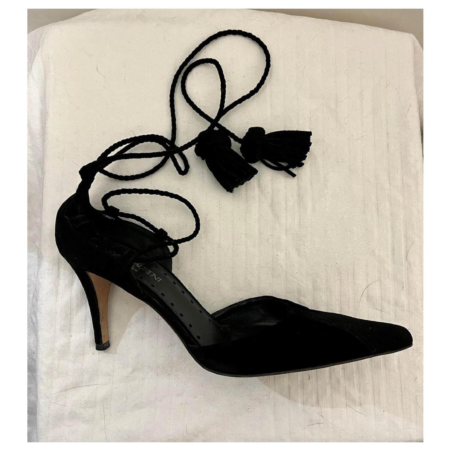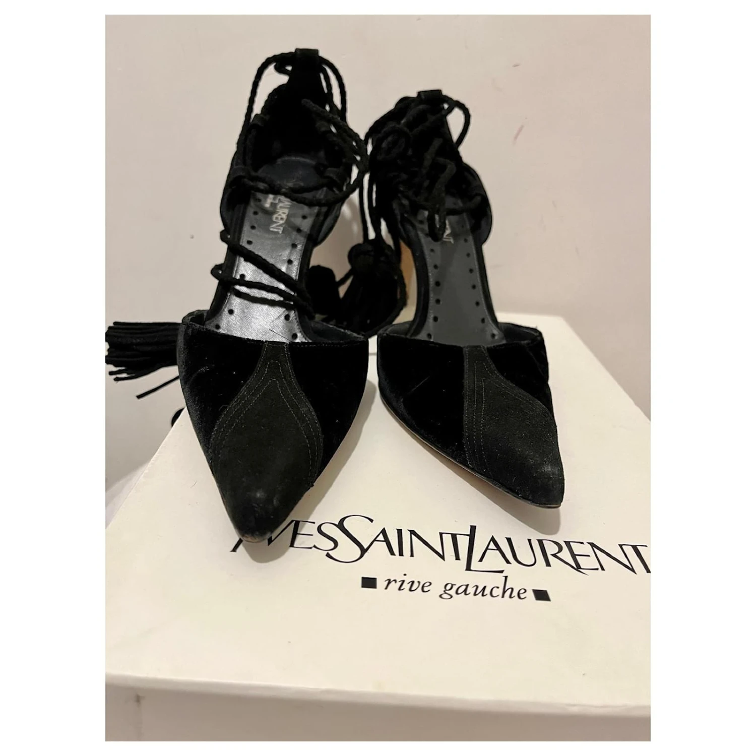 Chaussures de soirée YSL Sevilla en velours et chevreau (CUIR DE CHÈVRE) avec des brides de cheville qui sont tissées autour de la cheville et se terminent par un pompon. Ils sont de la ligne Rive Gauche, vintage original Saint Laurent à son meilleur, ils sont doublés de cuir noir et sont en très bon état avec des signes minimes d’usure. Il y a une petite éraflure au bas du talon, mais ce n’est pas visible lorsqu’il est porté. Talons super élégants et féminins. Ils viennent dans la boite d’origine.