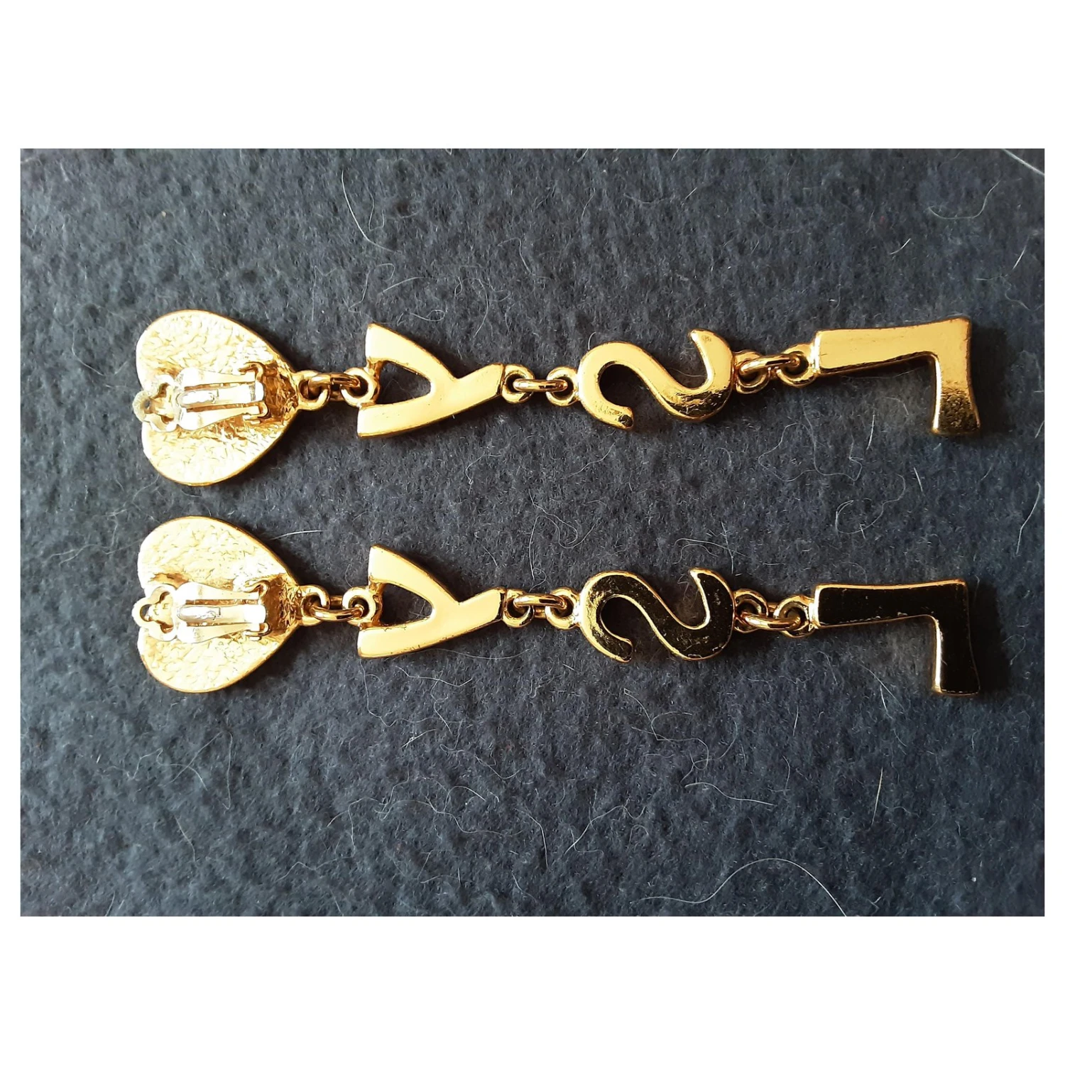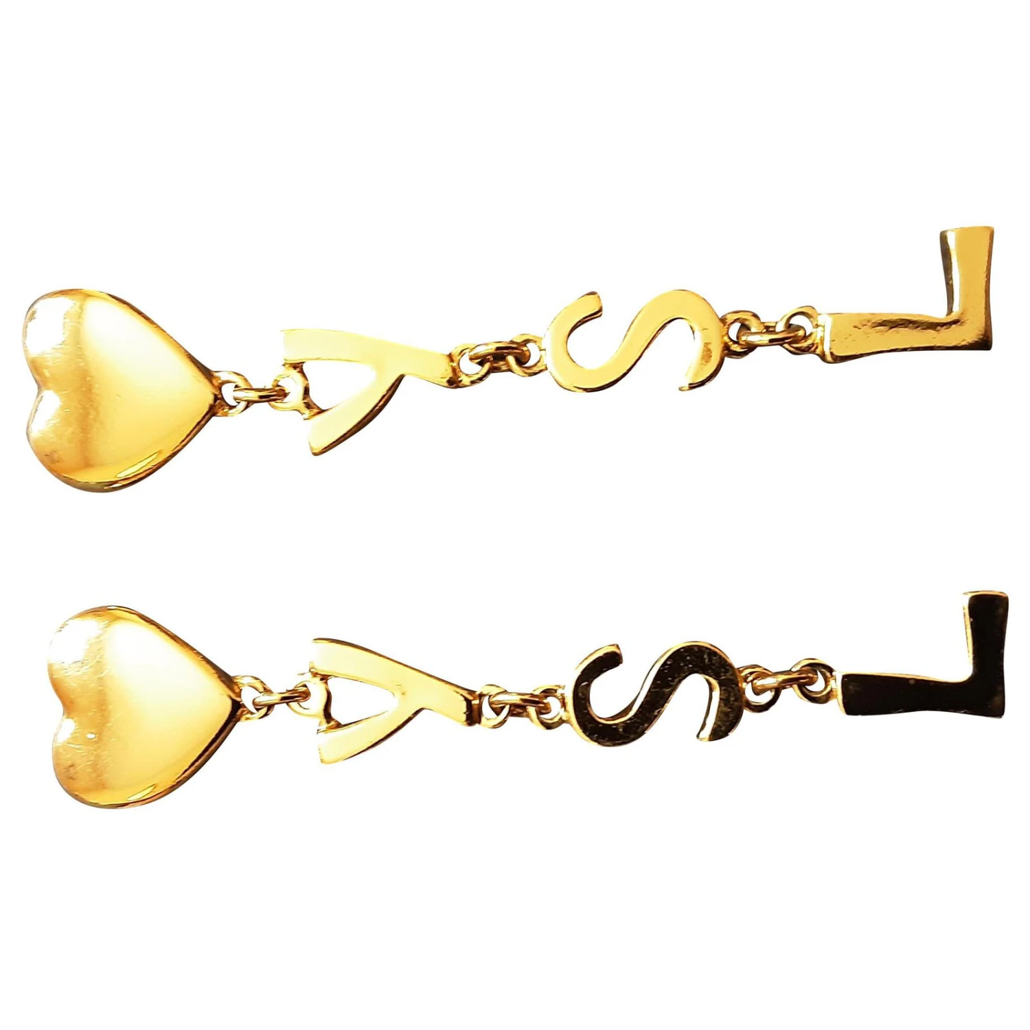 Boucles d’oreilles pendantes YSL dont chaque lettre est mobile car, articulée grâce à un anneau à la précédente, le tout ’ pendu ’ à un sublime coeur doré – emblème récurrent de Monsieur Saint Laurent – ces clips bougent et se meuvent élégamment au gré de vos pas.