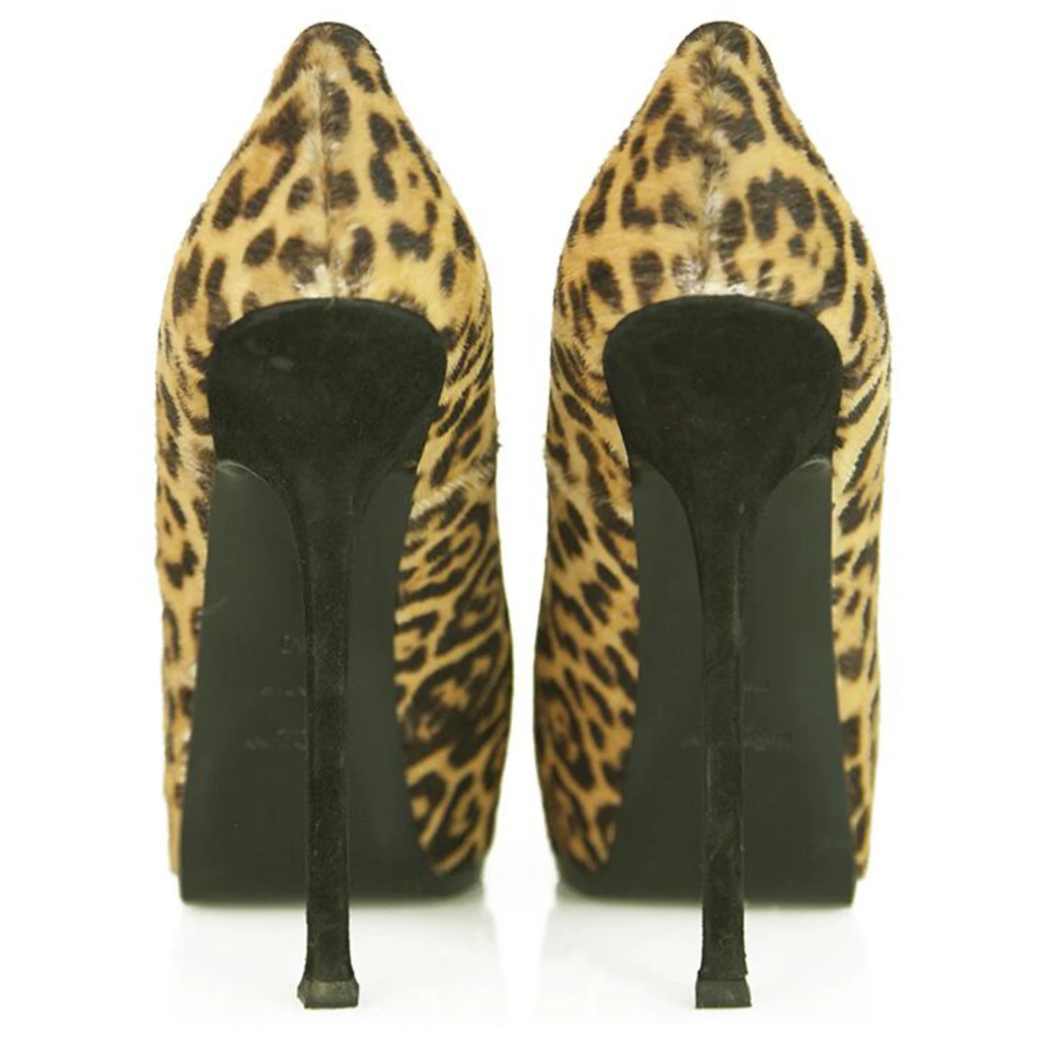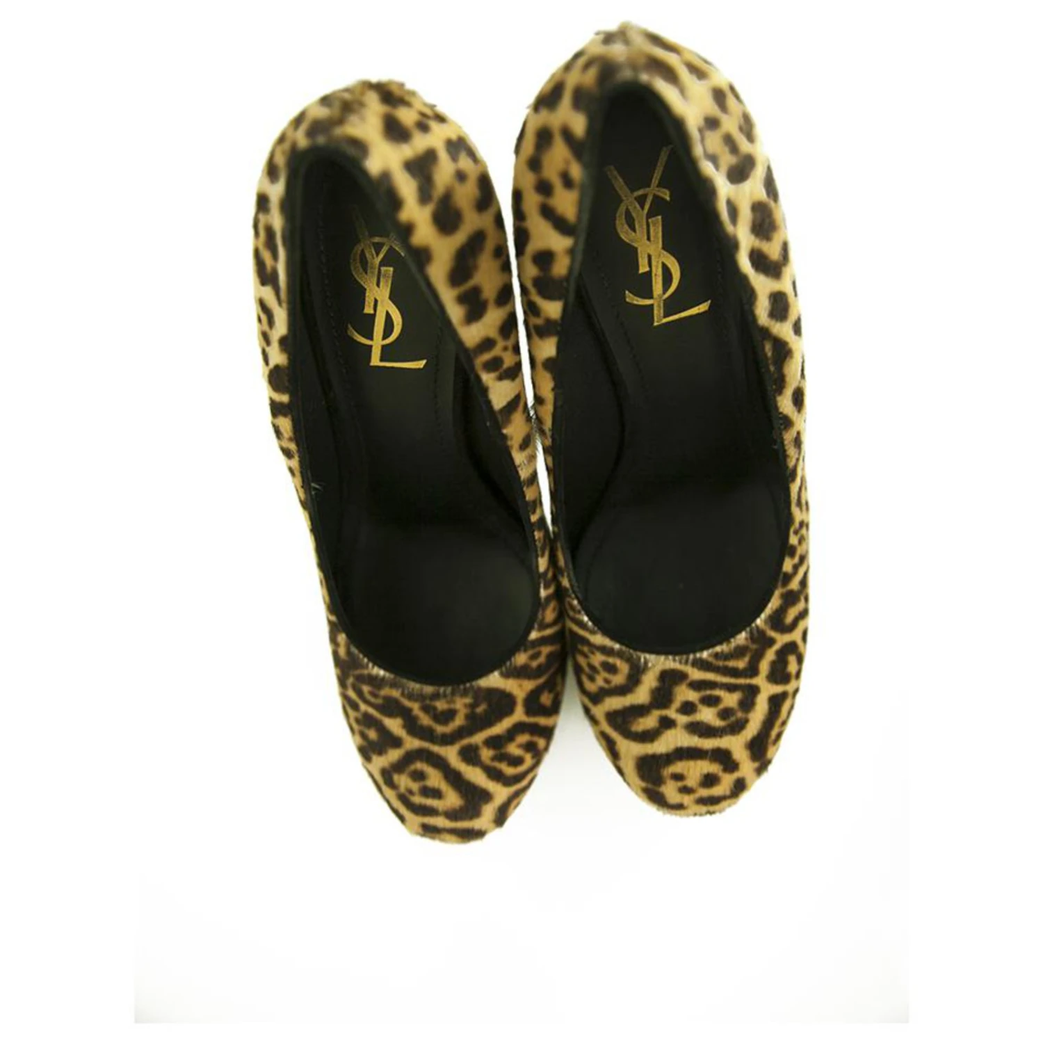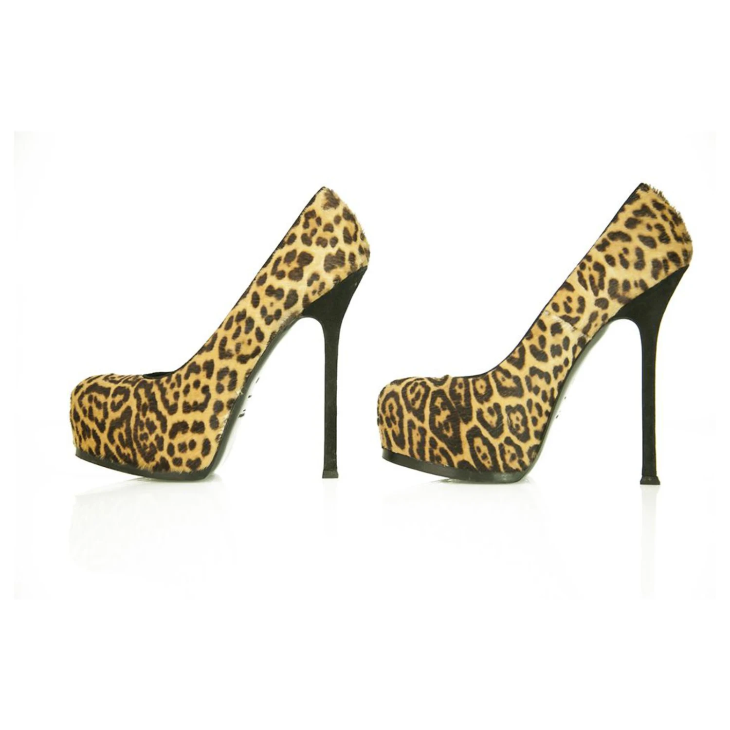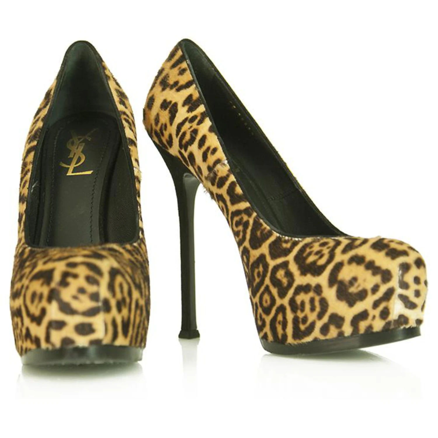 Ces extraordinaires escarpins Tribtoo cultes d’Yves Saint Laurent présentent un bout arrondi avec une plateforme interne, talons aiguilles et motif léopard confectionnés en cuir de veau façon poney dans une belle couleur gris anthracite. Les semelles intérieures sont doublées de cuir noir et estampées du logo. Ce style unique allongera vos jambes et ajoutera une silhouette sexy. Une paire que toute fashionista ne voudrait pas manquer! Prix en détail 880$.