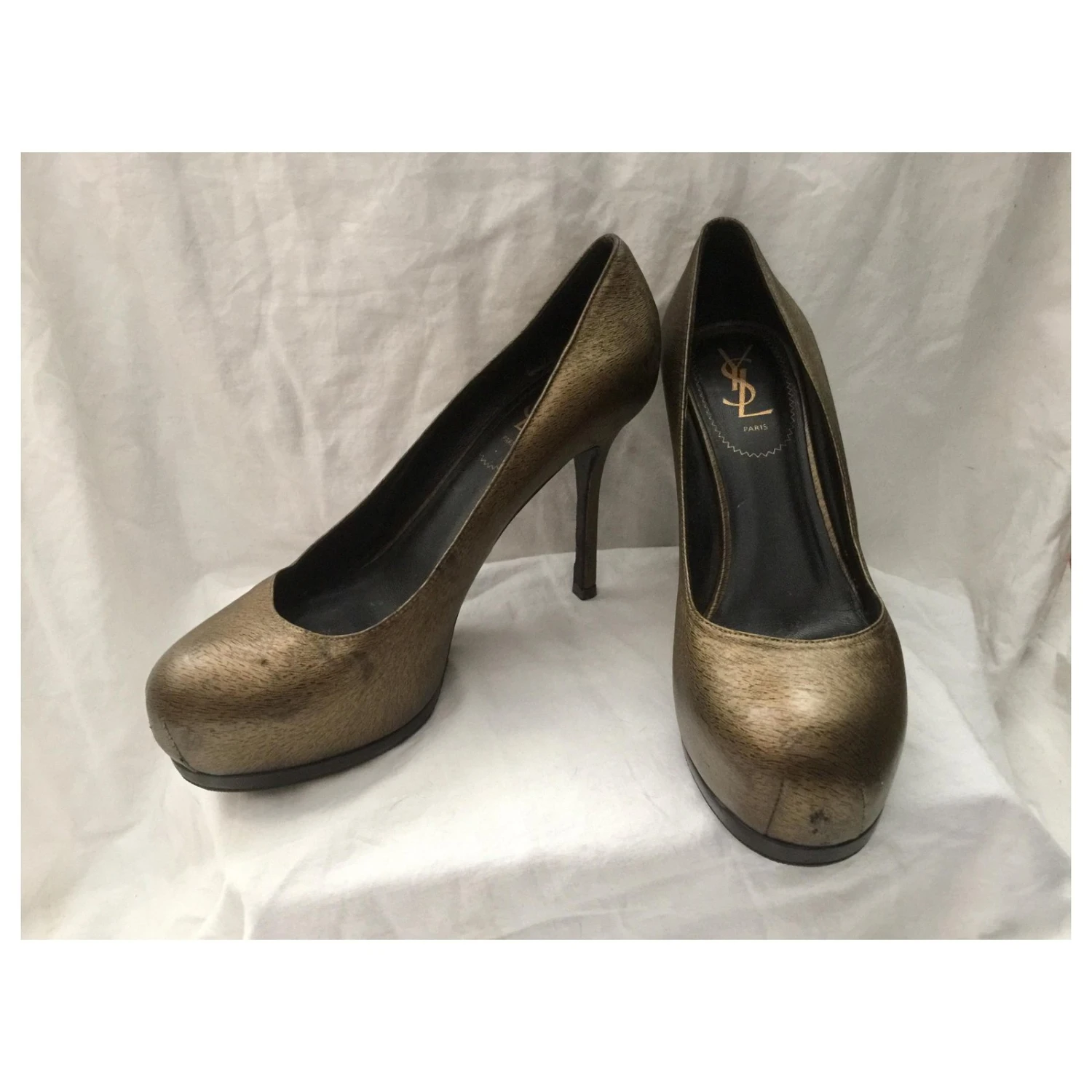 Escarpins plateforme à bout rond Yves Saint Laurent Tribute Rive Gauche en cuir doré et noir avec surpiqûres ton sur ton et talons recouverts. Quelques signes d’usure légers qui ne sont pas évidents lorsqu’ils sont portés et se fondent dans le motif.