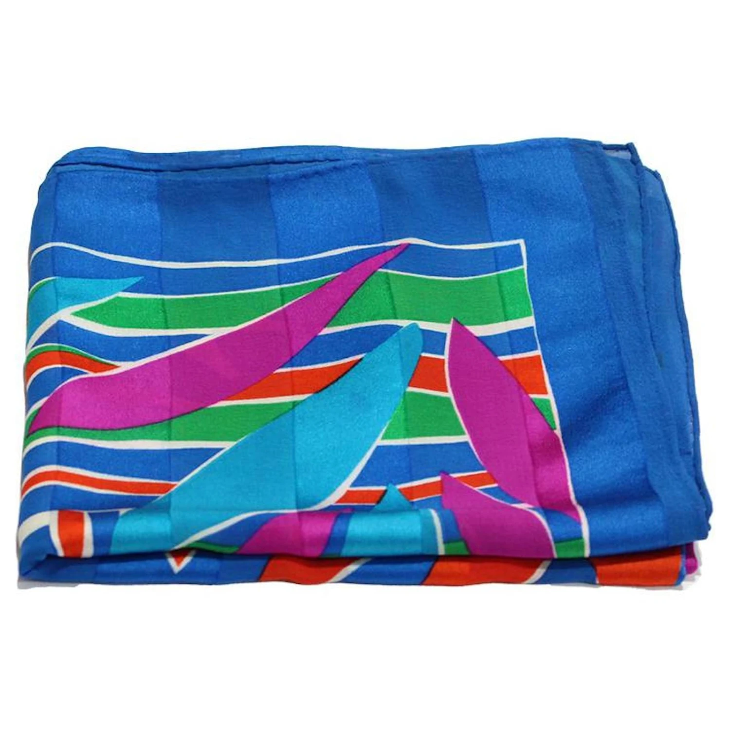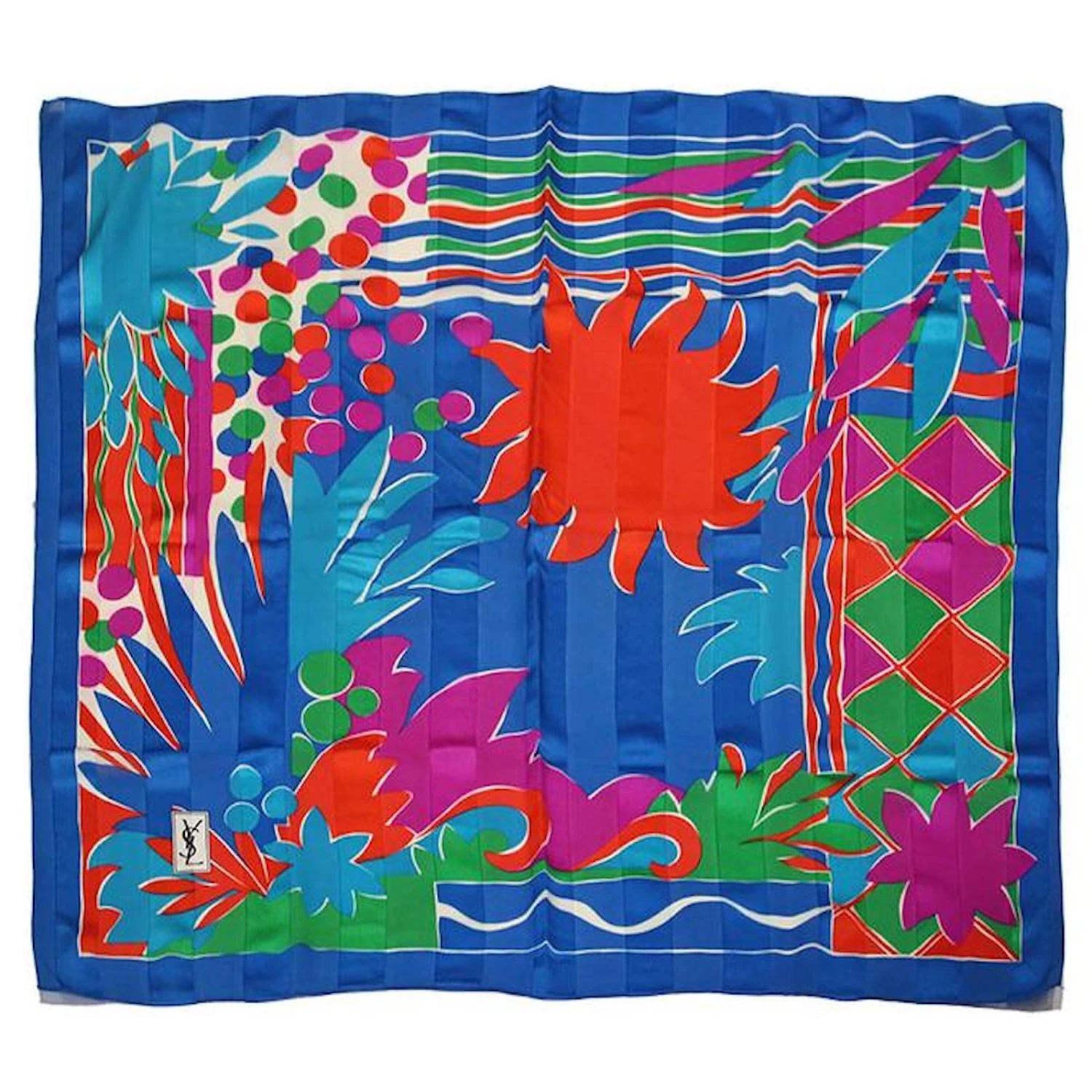 CARRE DE SOIE YVES SAINT LAURENT FOND BLEU IMPRIME FEUILLAGE
