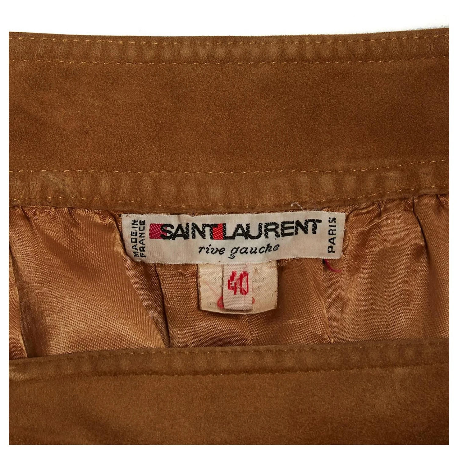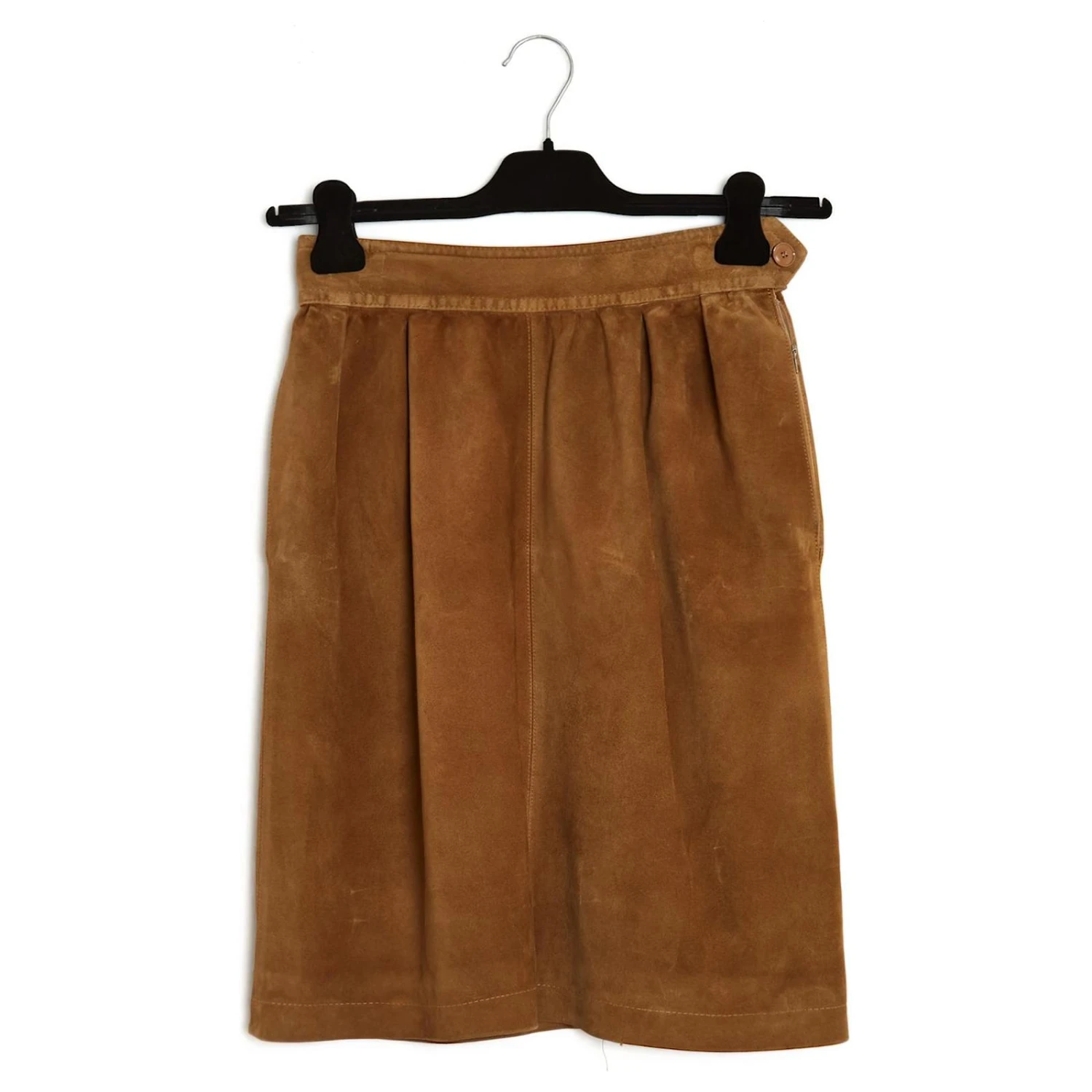 Jupe Yves Saint Laurent Rive Gauche en daim couleur camel, droite très légèrement froncée à la taille (haute), 2 fendues en biais sur les côtés, doublure en toile satinée coordonnée, fermée par un zip et un bouton. Taille 42 mais les mesures indiquent un 36FR : taille 35 cm, longueur 55 cm. La jupe est vintage, le bouton n’est pas d’origine et le daim présente de légères traces d’usage mais la jupe sort du pressing et elle est en très bel état, coupe avantageuse et féminine, matière souple et sensuelle, couleur parfaite …