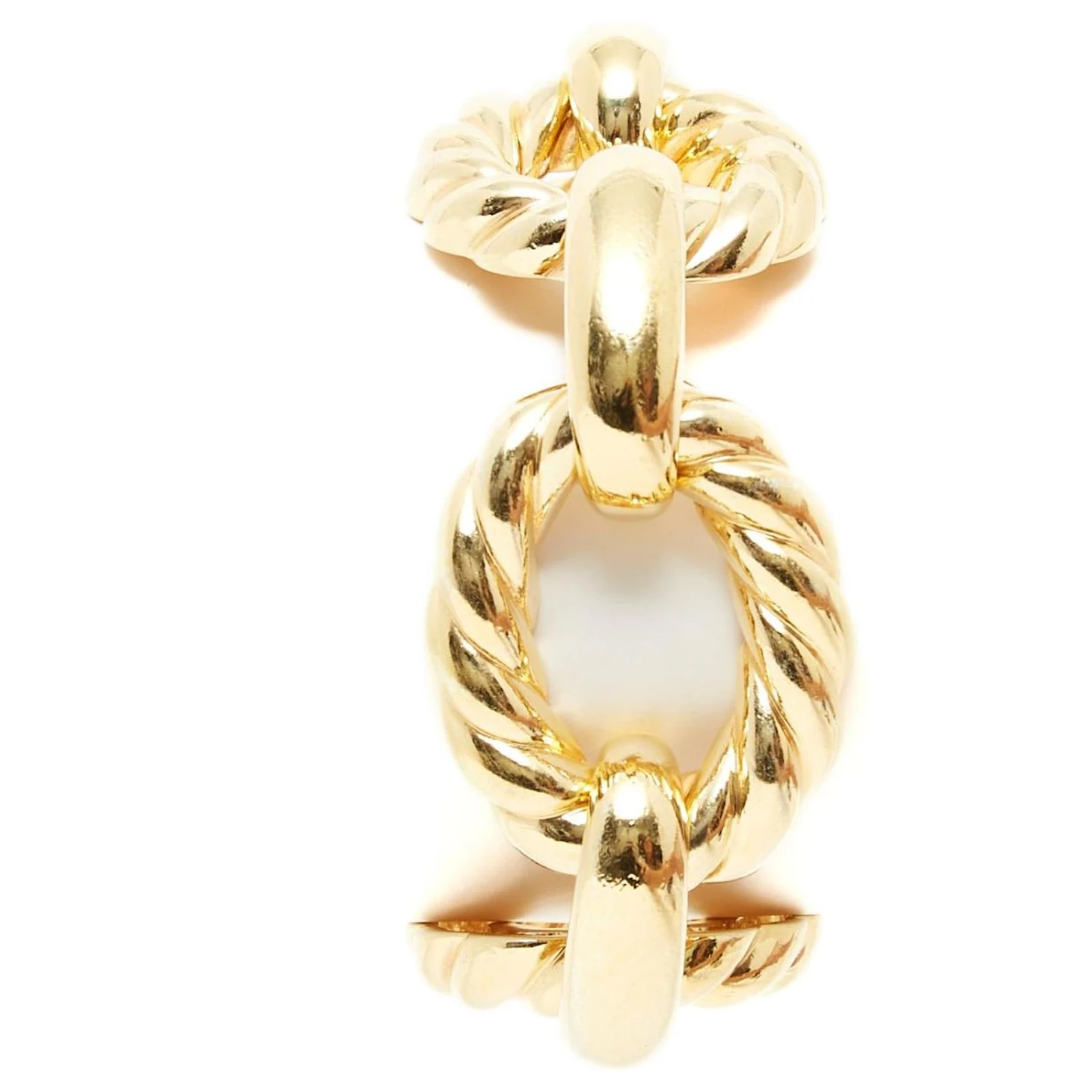 Bracelet Yves Saint Laurent composé de 4 très gros anneaux de forme ovale à motif de godrons en métal doré. Longueur totale 20 cm, fermeture à 17/18 cm environ, largeur du bracelet 3.3 cm. Le bracelet est vintage et il a dut être redoré car il semble en état neuf et il est magnifique au poignet, ultra chic !