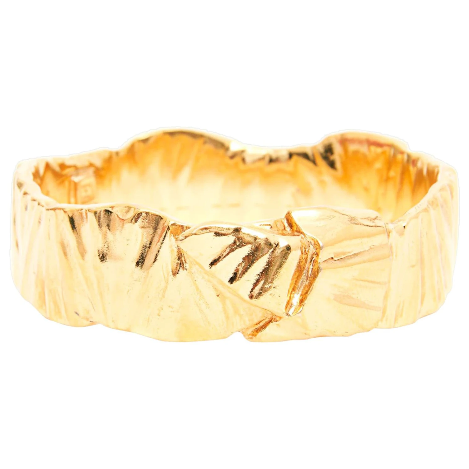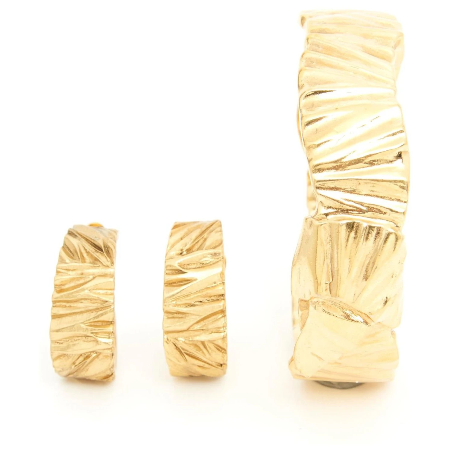 Bracelet Yves Saint Laurent en métal doré au motif d’un ruban froissé et noué. Largeur (vu du dessus) 2 cm, diamètre intérieur 6,5 cm. Le bracelet est vintage, en très bon état, parfait porté seul ou avec les boucles d’oreille également en vente sur ce site.