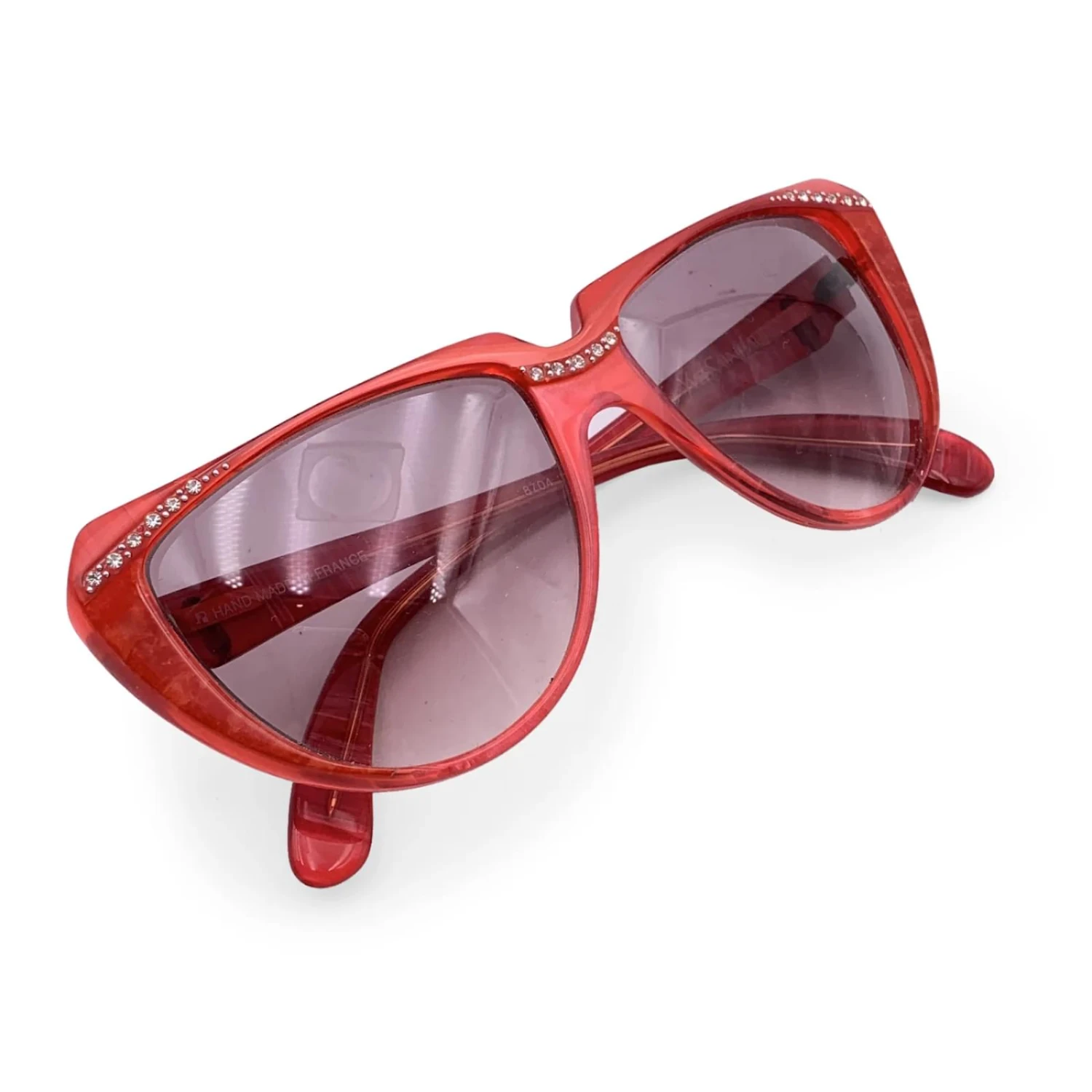 Lunettes de soleil œil de chat vintage par YVES SAINT LAURENT des 80S, mod. 8704 P 74. Monture rouge agrémentée de petits strass sur le pont du nez et sur les coins. Fabriqué à la main en France. Logos YSL sur le côté. NEW 100% Verres dégradés de protection UV. Détails MATÉRIEL: Plastique COULEUR: MODÈLE rouge: 8704 P 74 Le sexe: Femme PAYS DE FABRICATION: BOÎTE D’ORIGINE France?: Pas de STYLE: COULEUR DES LENTILLES Cat Eye: Condition rose A + – NEUVE NOS – Nouveau stock ancien – Jamais porté ou utilisé – Ils seront livrés avec un boîtier GÉNÉRIQUE Mesures EYEWEAR MAX WIDTH:145 Mm Temple Max. de longueur: 130 oeil mm / LENTILLE MAX. Largeur: 55 oeil mm / LENTILLE MAX. HAUTER: 48 Mm Bridge Mid. Largeur: 14 MM