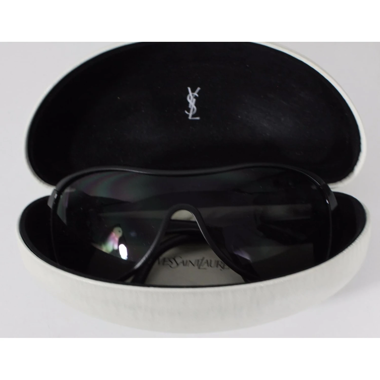 Lunettes de soleil masque Saint Laurent de couleur noir. Livré avec son étuis et chiffon en microfibre d’origine. Collection été 2015.