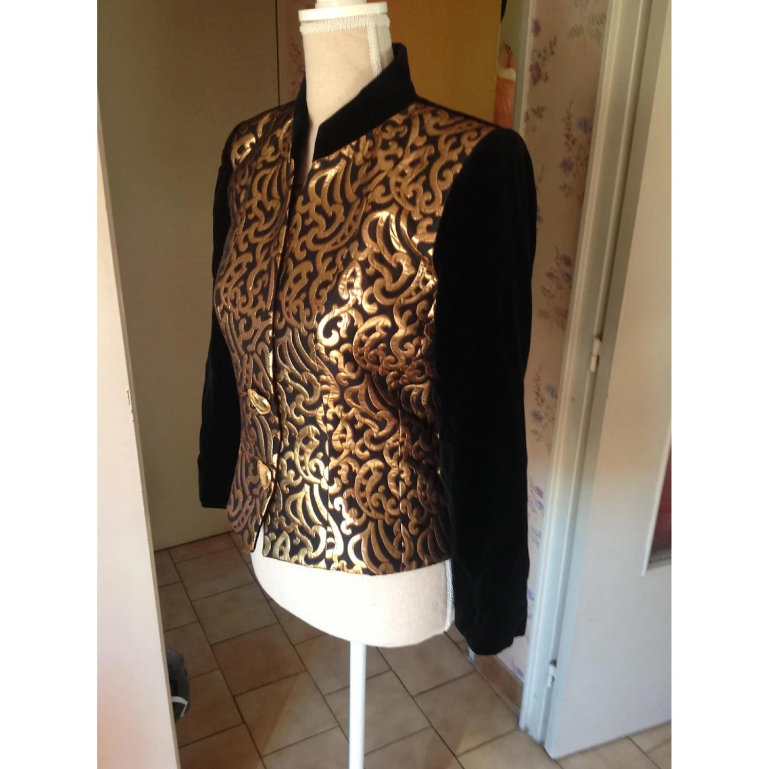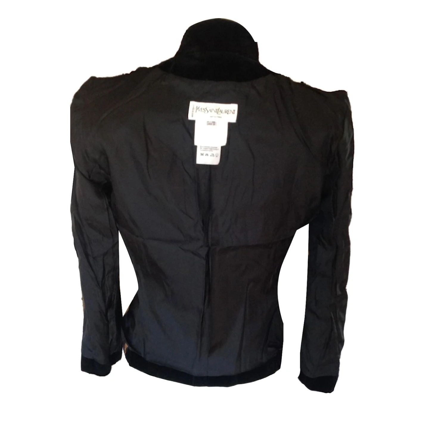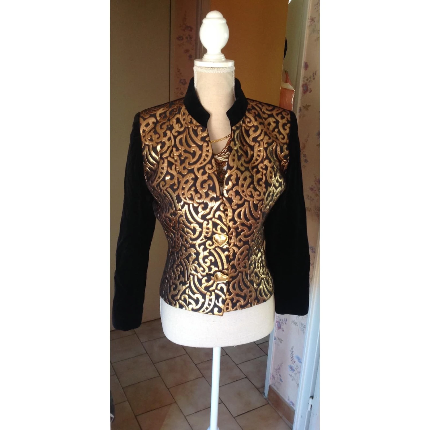 Inégalable blazer noir et morif dorés de chez yves saint laurent – taille 40. Un bijou de blazer fermant avec deux sublimes boutons en forme de cœur des jolis bijoux, élément vital pour yves saint laurent. Une jolie coupe cintrée et épaulée lui donné une élégance et un chyc hors du commun. Le dos et les manches sont en velours noir lisse. Très peu servi, il a été rangé soigneusement. Très belle affaire à saisir
