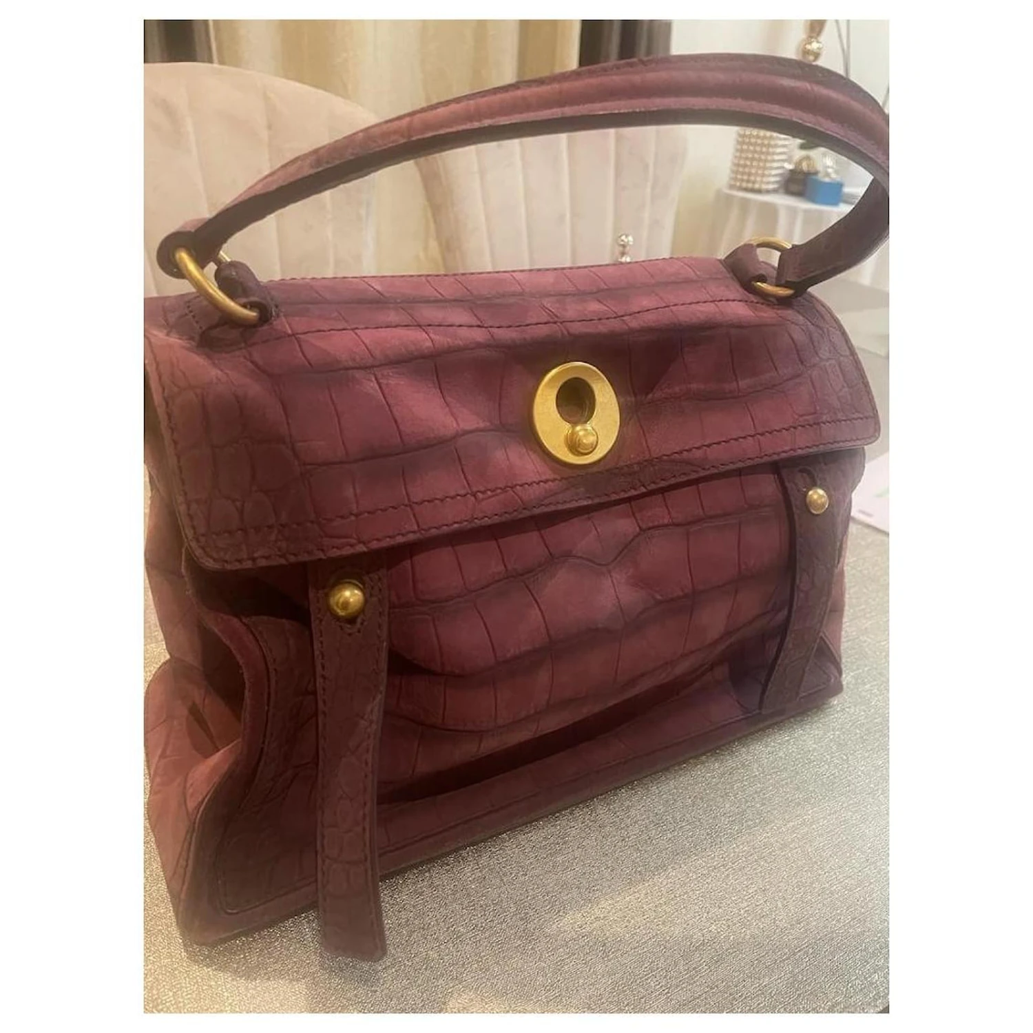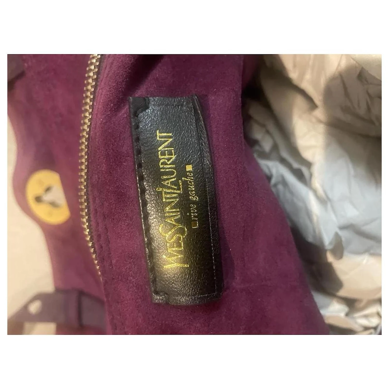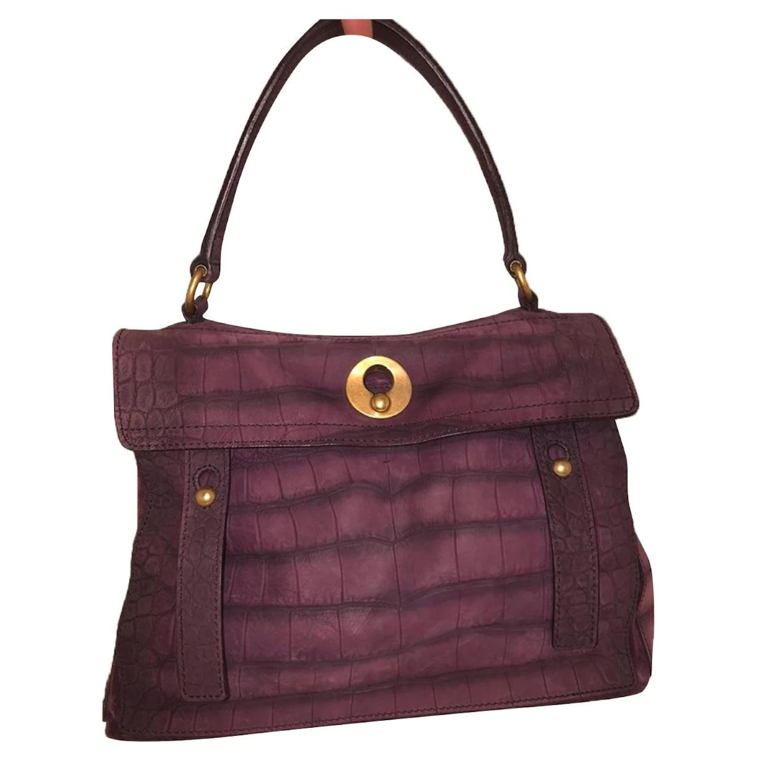 Raffiné et élégant sac à main Yves Saint Laurent Muse Two en cuir et suédé violet, garniture en métal doré