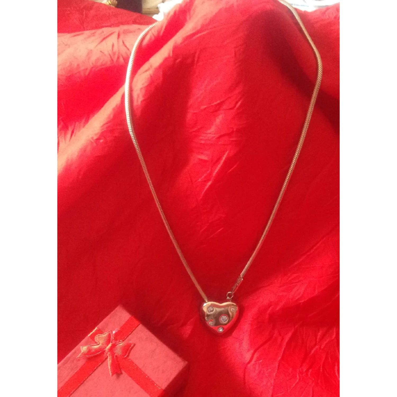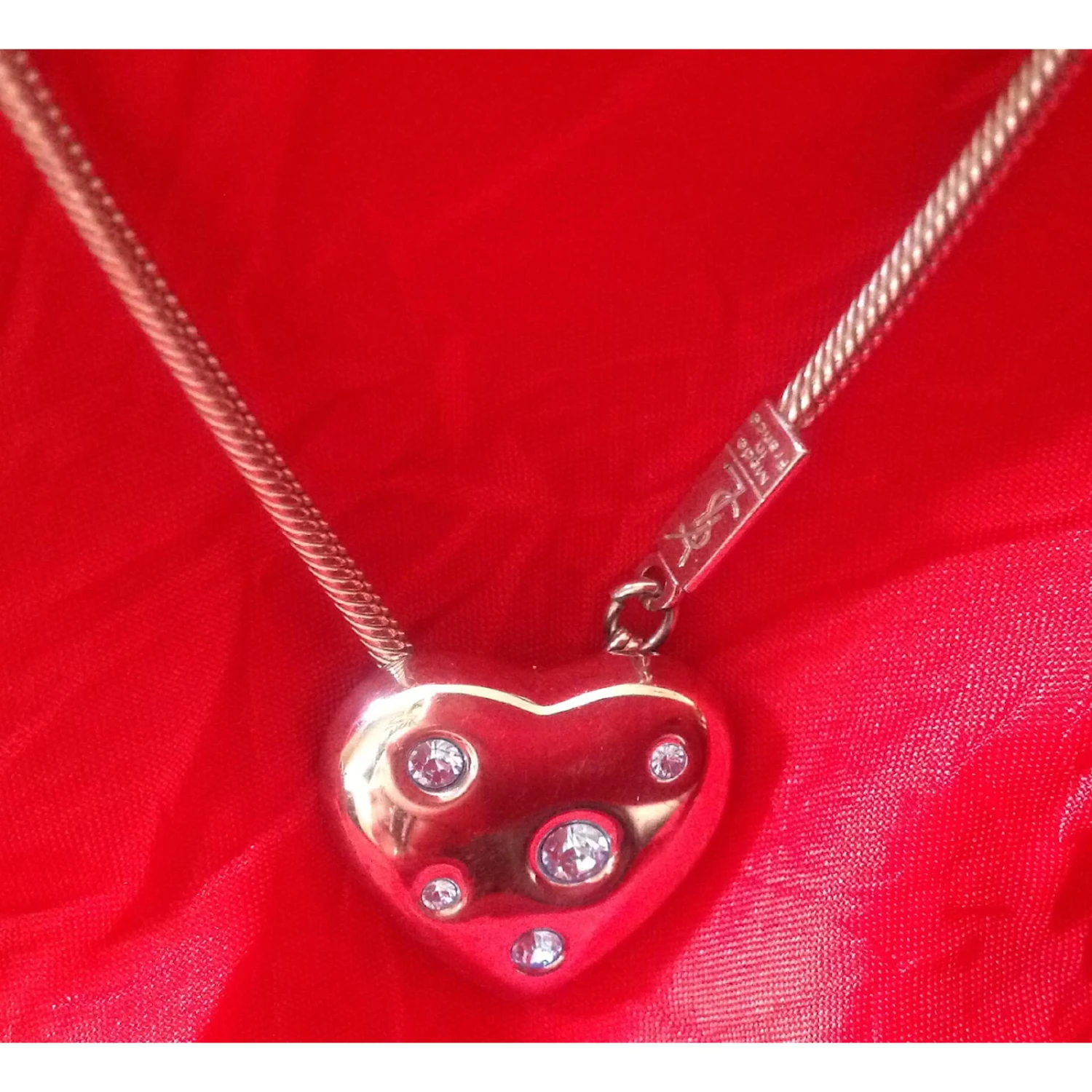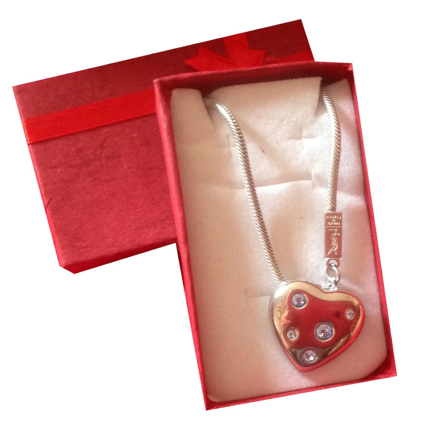 Magnifique pendentif en forme de cœur avec cristaux bleus de chez yves saint laurent. Tout argent il porte sur la chaîne une minuscule plaque siglée ysl. Chaîne serpent trés jolie portée. Le coeur organe sensible chez yves saint laurent inspirant l’amour. Il est vendu dans un écrin rouge, voir photos. Trés bien soigné et peu porté