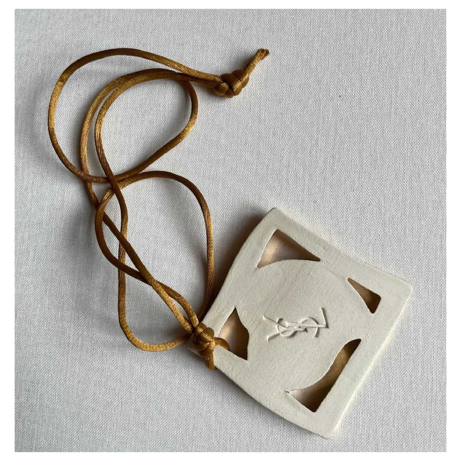 Collier Yves Saint Laurent Coeur Vintage. édition limitée pour les 1990 saint Valentin. Le pendentif est un carré en céramique dorée avec un cœur rouge au centre. Cordon de soie beige. MESURES: 5. cm x 5.5 cm. Il est livré avec une pochette.