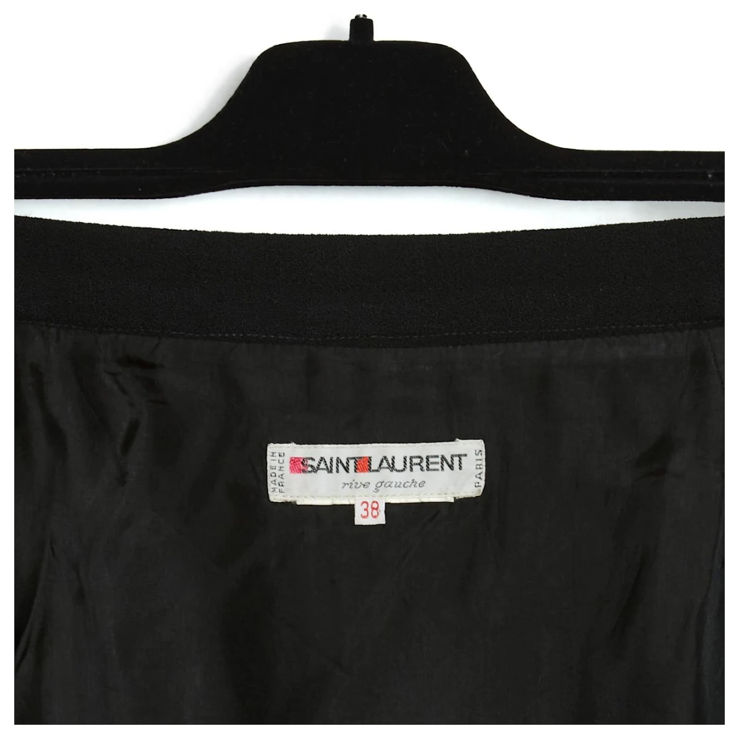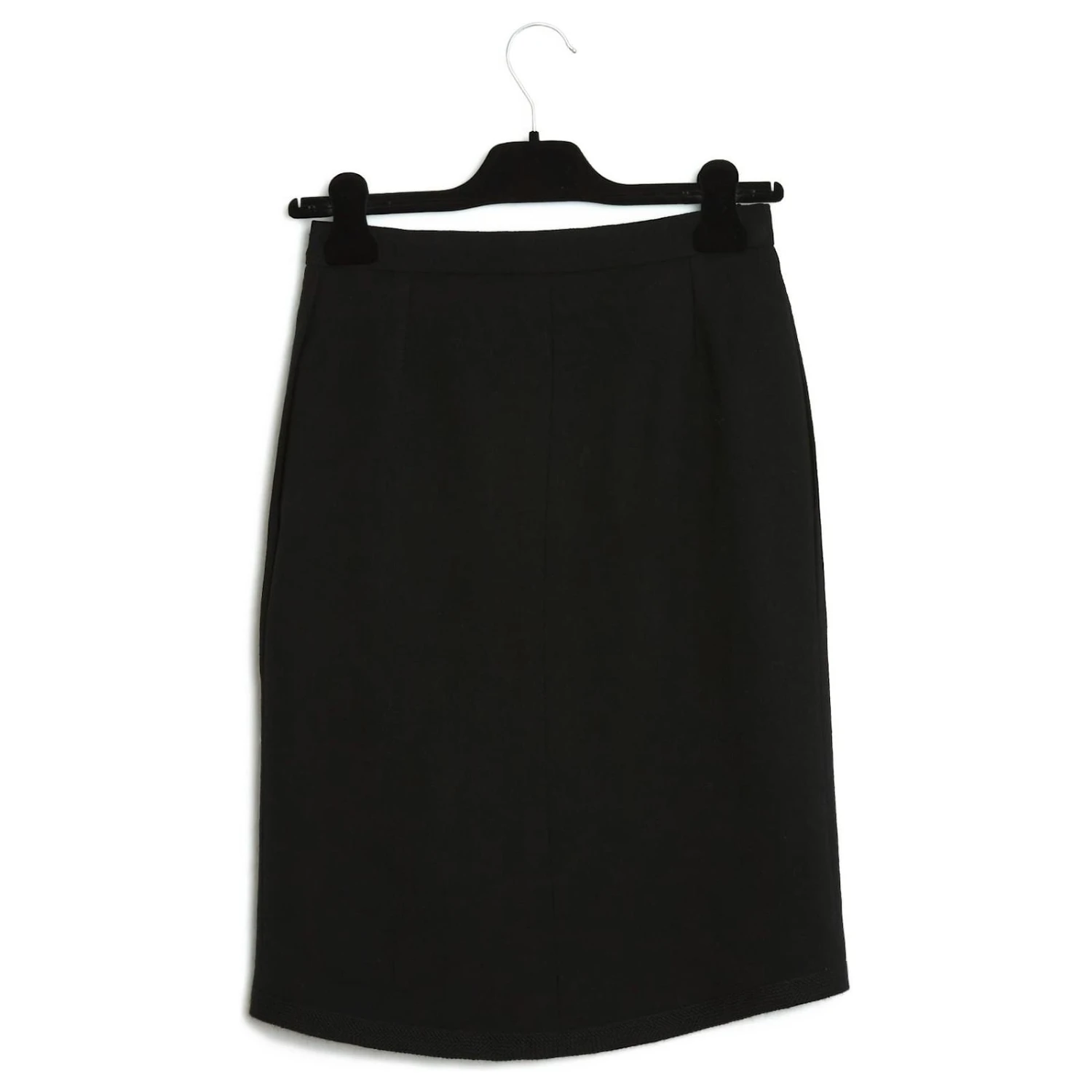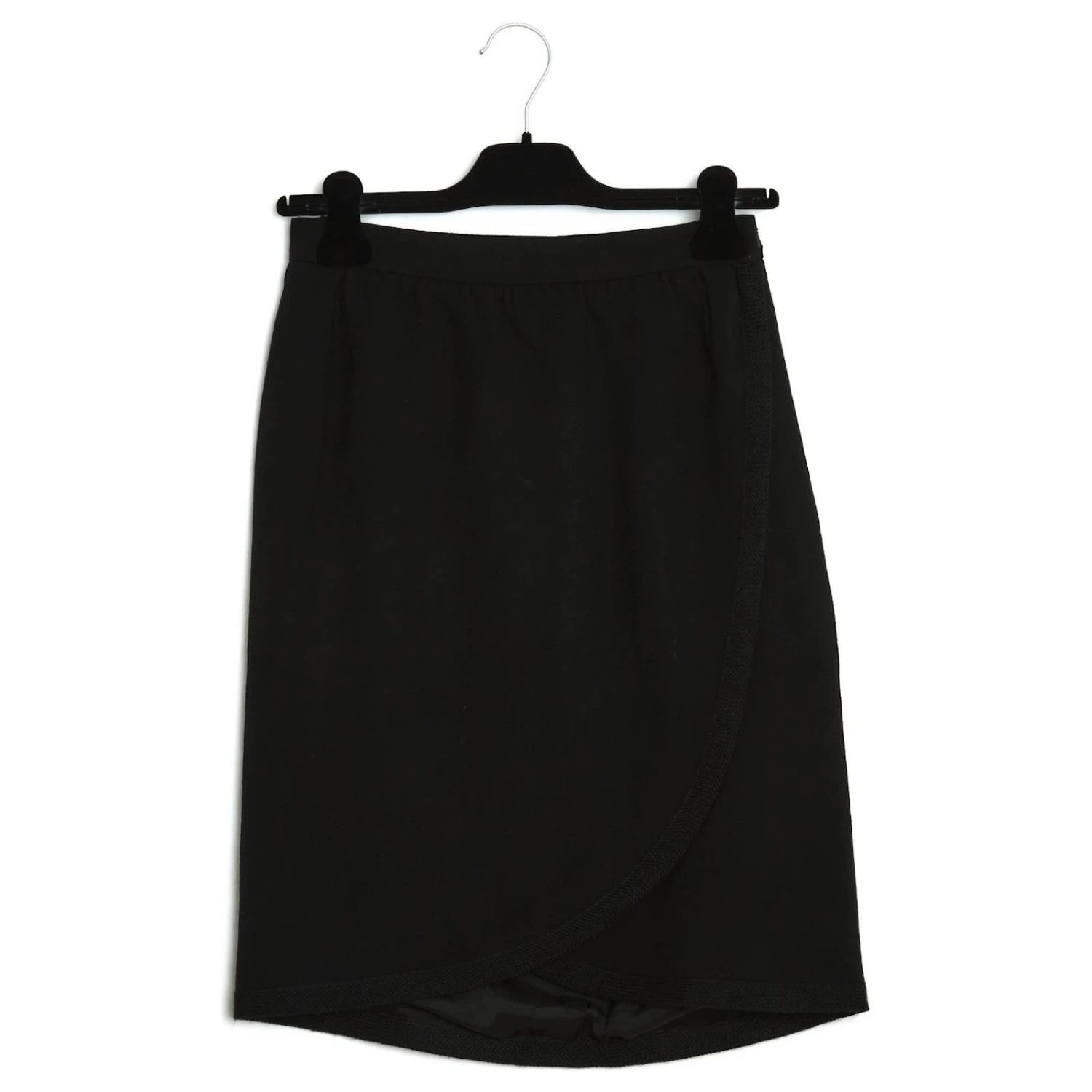 Jupe Saint Laurent Rive Gauche en épais crêpe de laine noir forme portefeuille avec 2 pans arrondis croisés devant, gansés d’une passementerie de laine, 2 poches fendues sur les côtés, doublure de toile satinée noir, fermeture par 2 crochets. Taille 38FR mais les mesures indiquent un 36FR : taille 35 cm, longueur 52 cm devant et 58 cm au dos. La jupe est vintage, en très bon état, ultra féminine et chic.