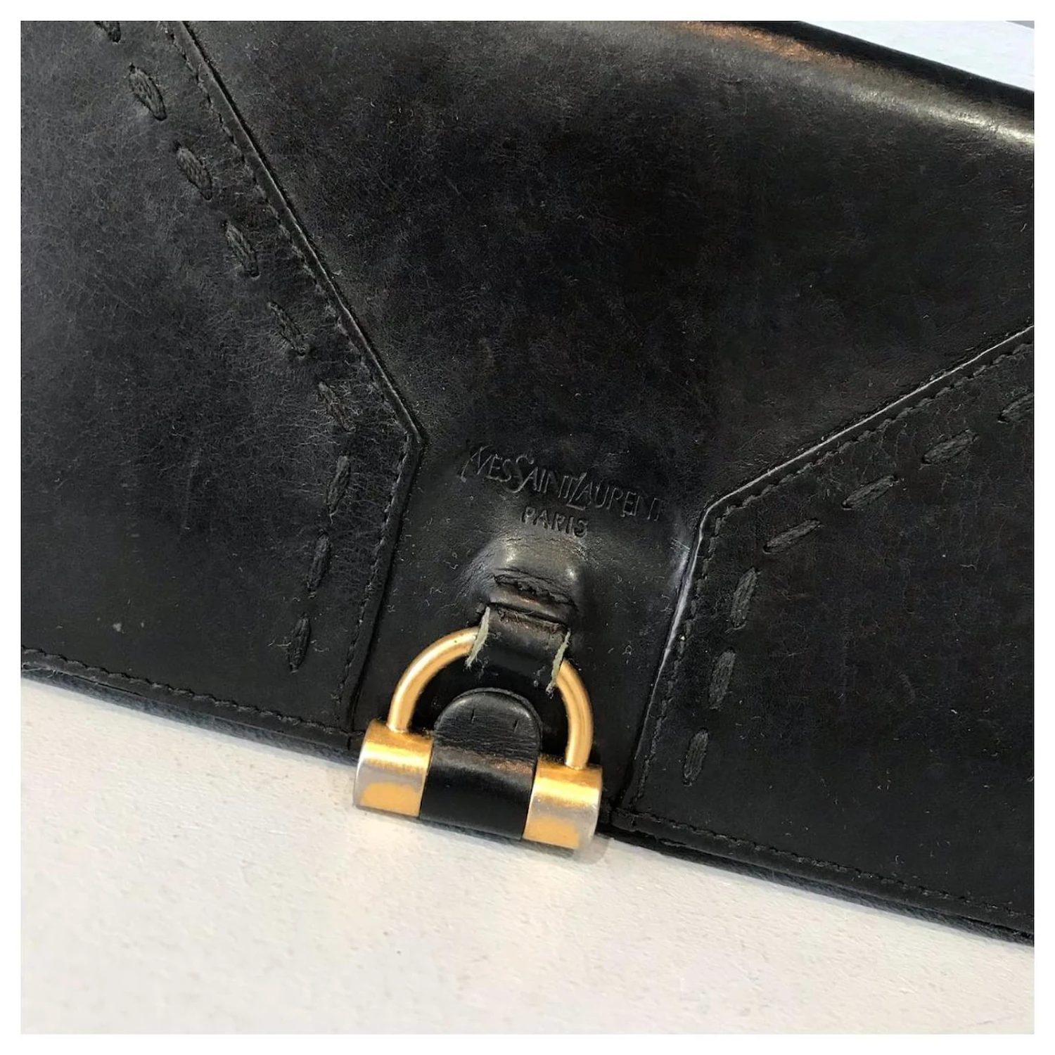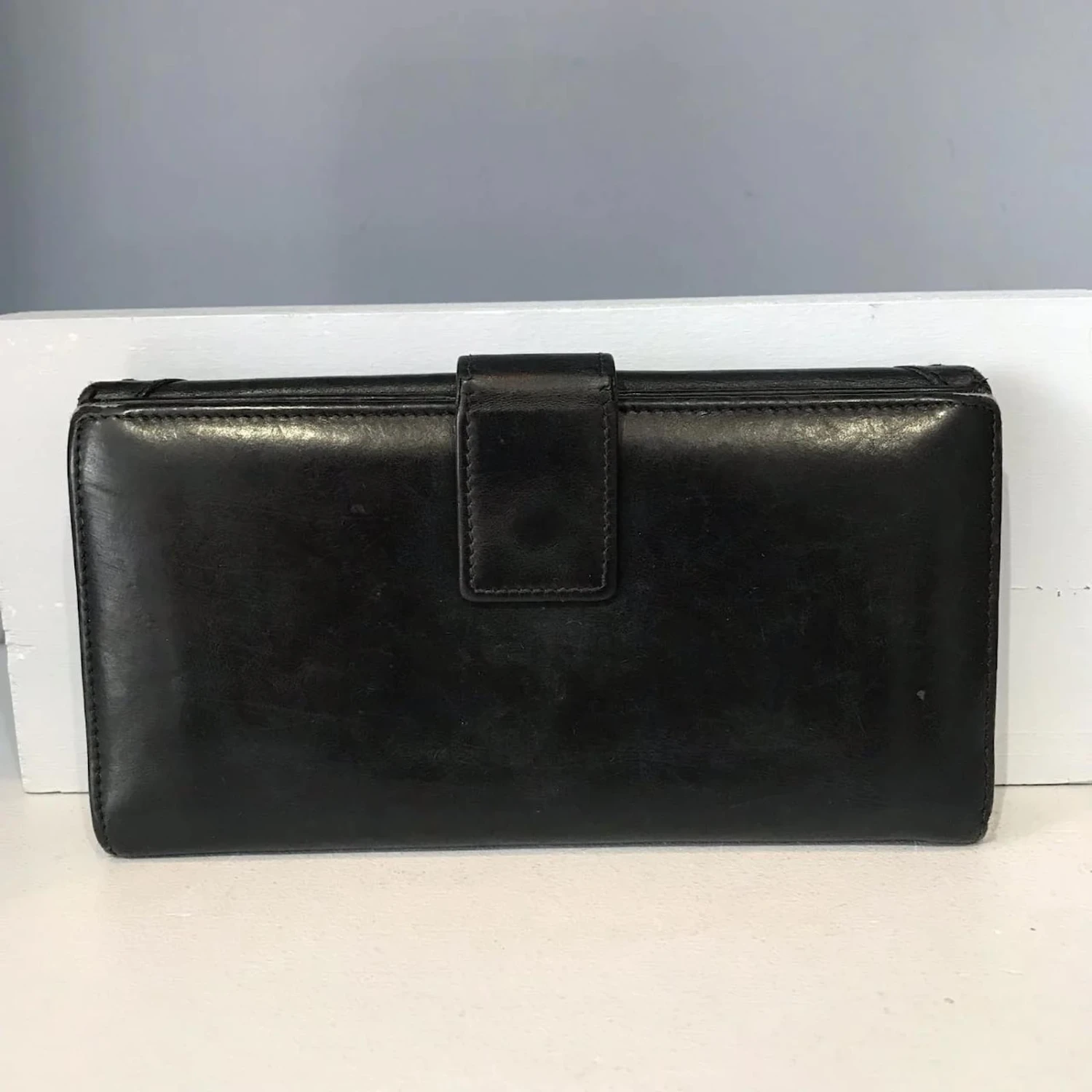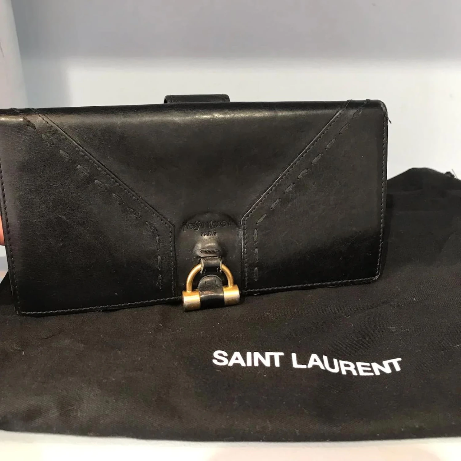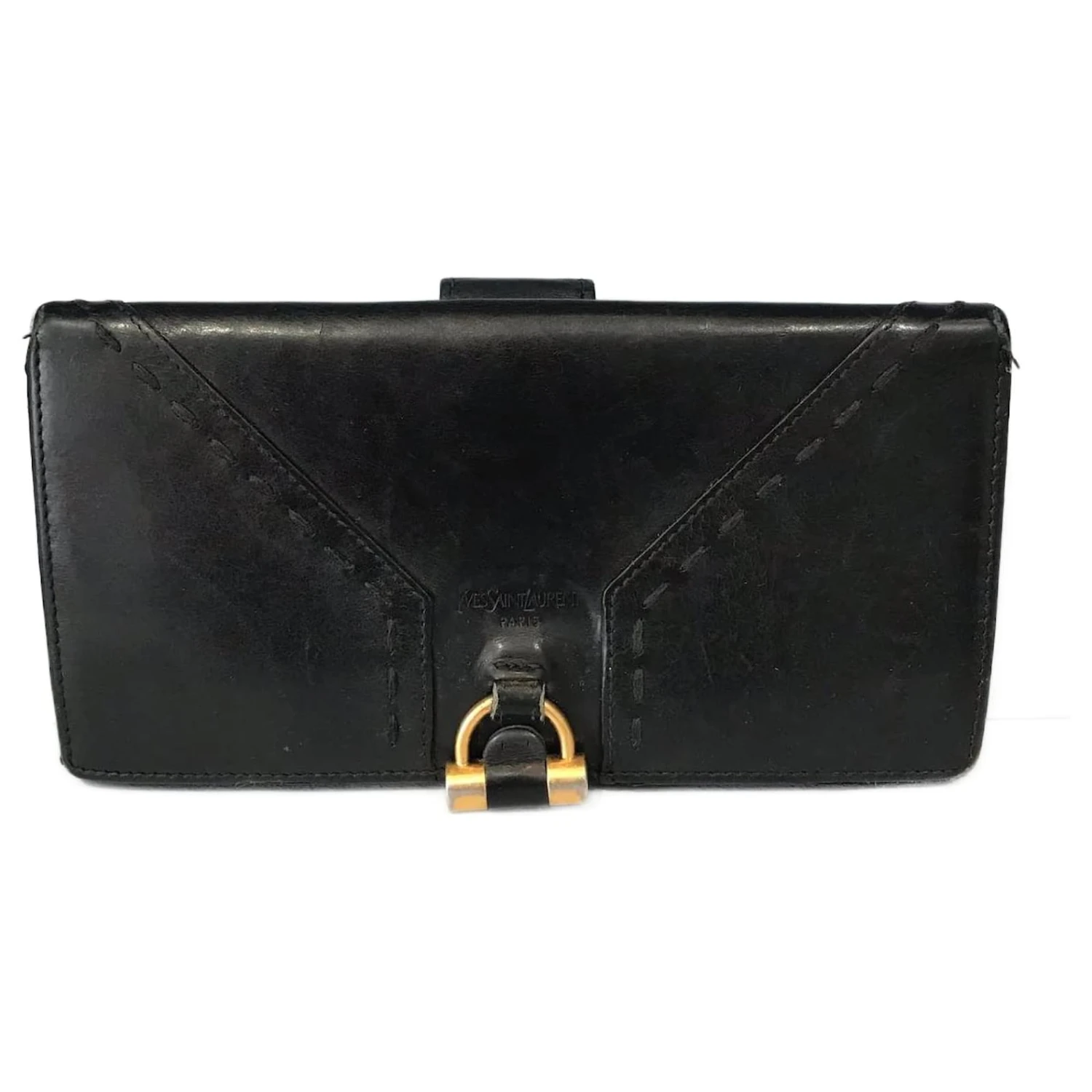 Portefeuille Yves Saint Laurent en cuir noir muse. Portefeuille avec fermeture à pression. Stockage des cartes et des tickets, ainsi que des pièces pour chambres. Etat : coins frottés et plusieurs marques. With dustbag.
