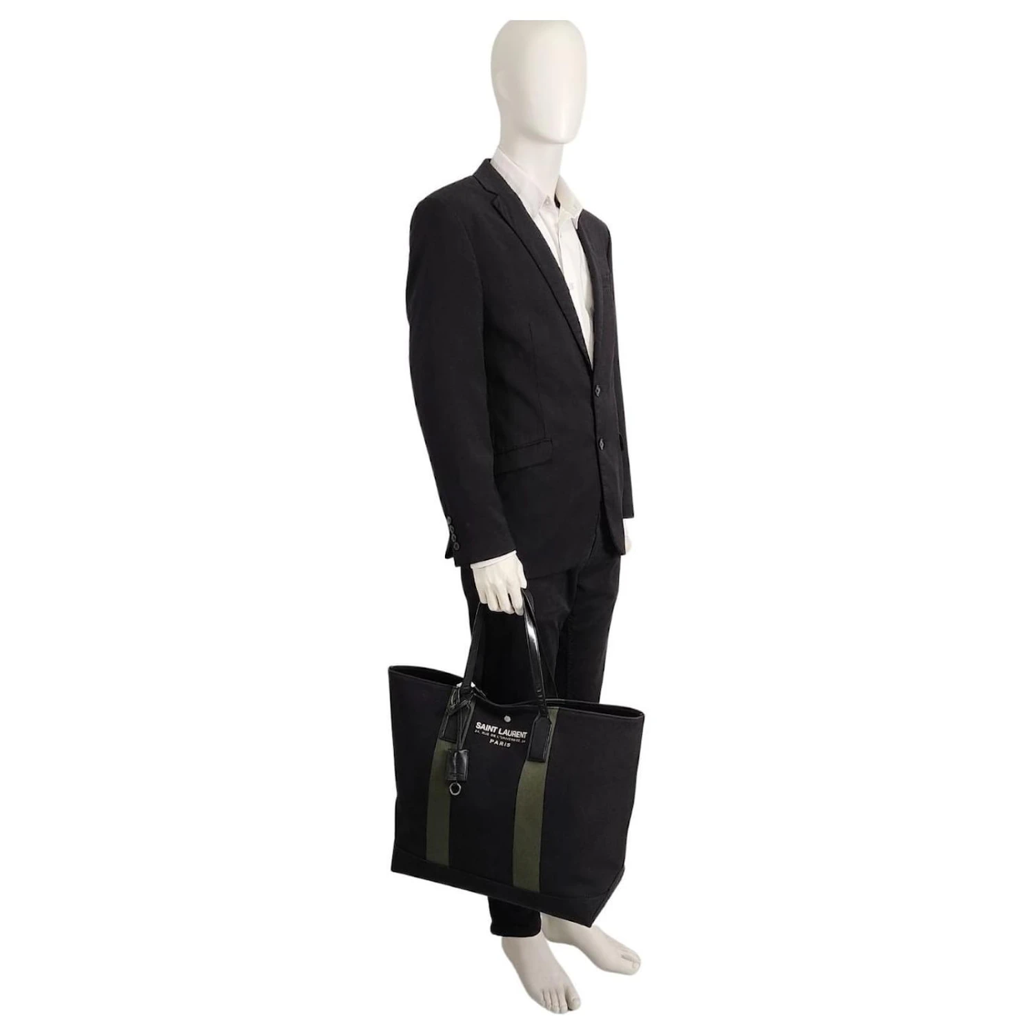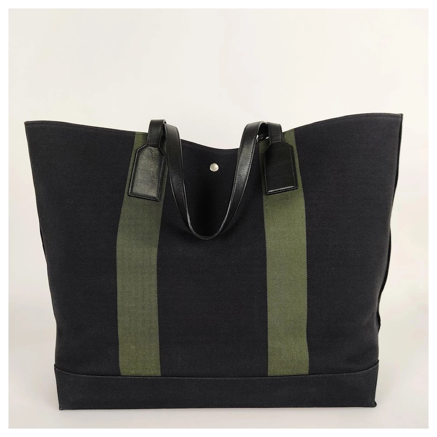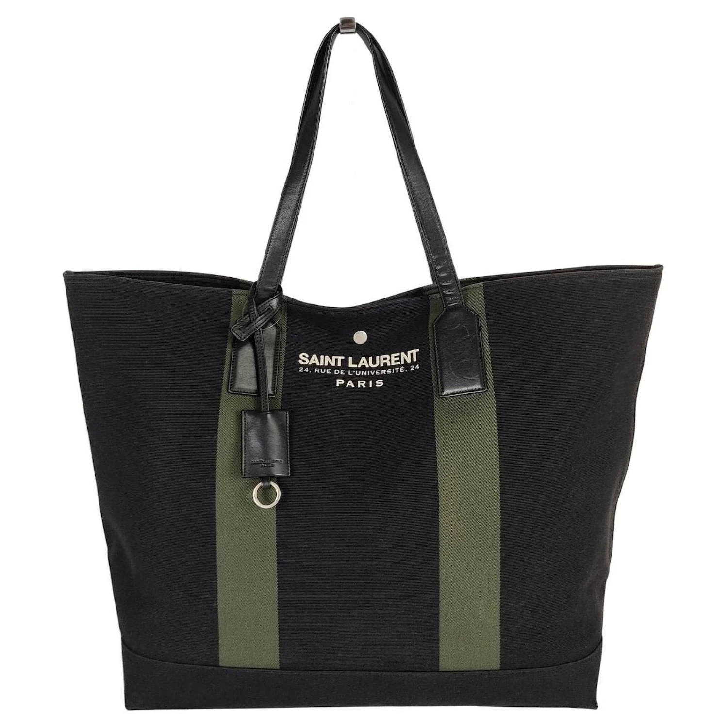Sac à main Saint Laurent modèle Shopper Rive Gauche en toile noire.avec poignées en cuir noir, bande verte et imprimé ivoire.Équipé d’une breloque porte-clés.Fermeture avec bouton automatique en acier.Modèle unisexe également idéal pour les week-ends.Peu utilisée, pas de défauts.Dimensions: L: 40x53cm – H : 35cm – L : 16cmTous nos articles sont sélectionnés, soigneusement désinfectés et authentifiés par nos experts.Code : 5175b354MARQUE : Saint LaurentMODÈLE : Sac à main Shopper Rive Gauche en toile noireMADE IN : ItalieCODE D’AUTHENTICITÉ : GUE4130540116Couleur noireMATÉRIEL : ToileCONDITION : Excellent