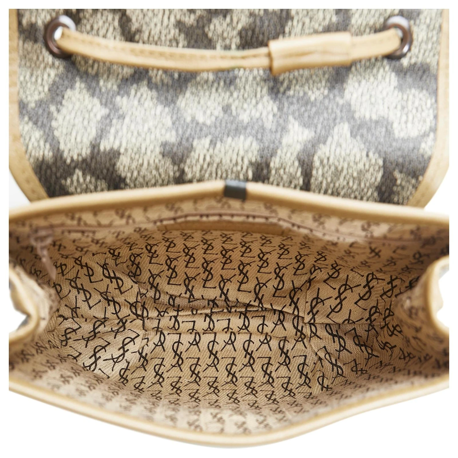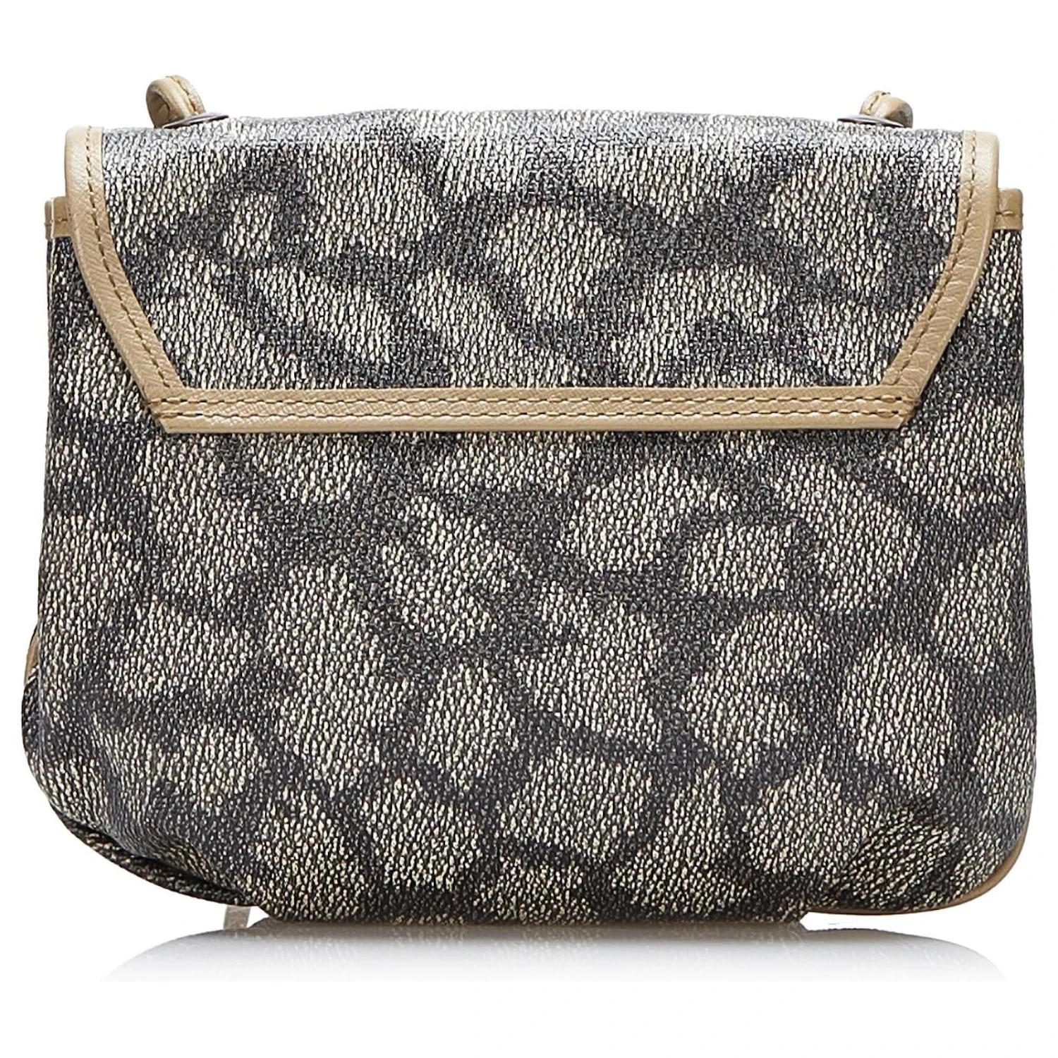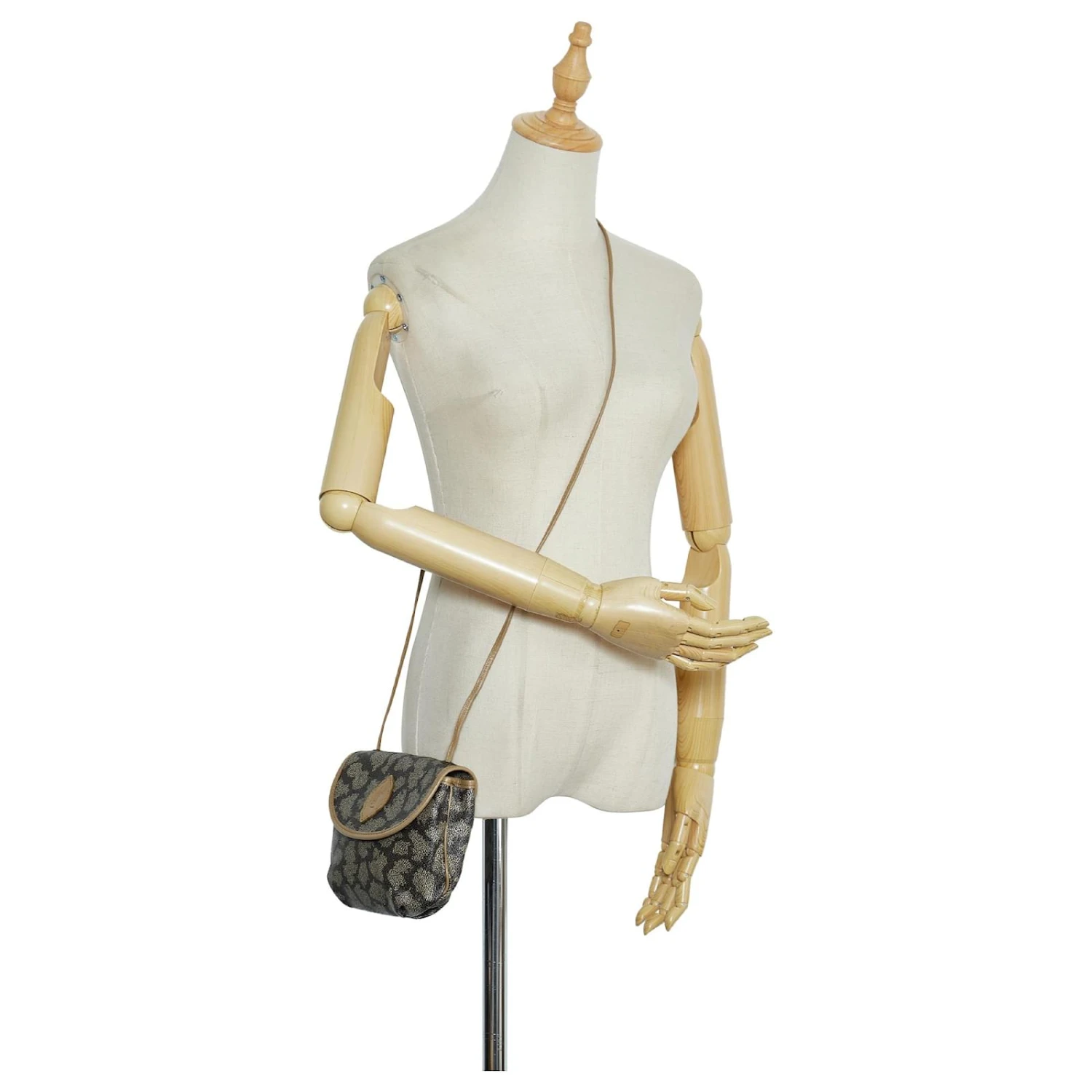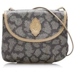 Ce sac à bandoulière en toile enduite imprimée avec une bordure en cuir, une bandoulière en cuir plat, rabat frontal à fermeture magnétique, et une poche intérieure zippée. Il porte une cote B + condition.