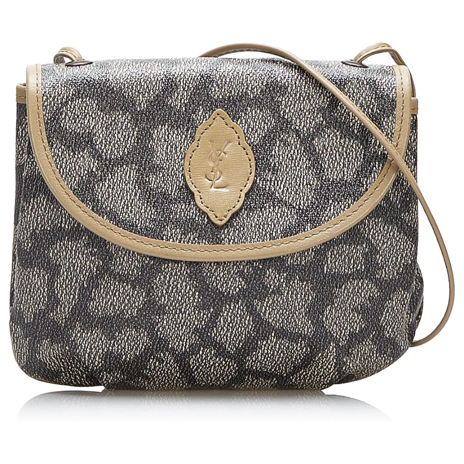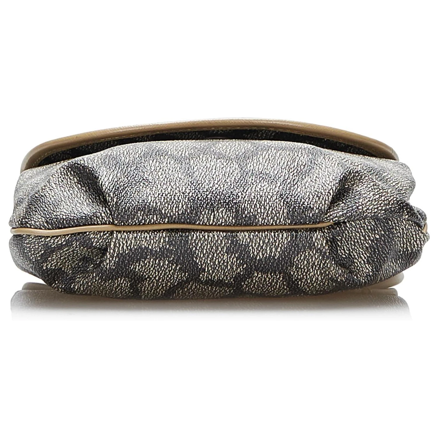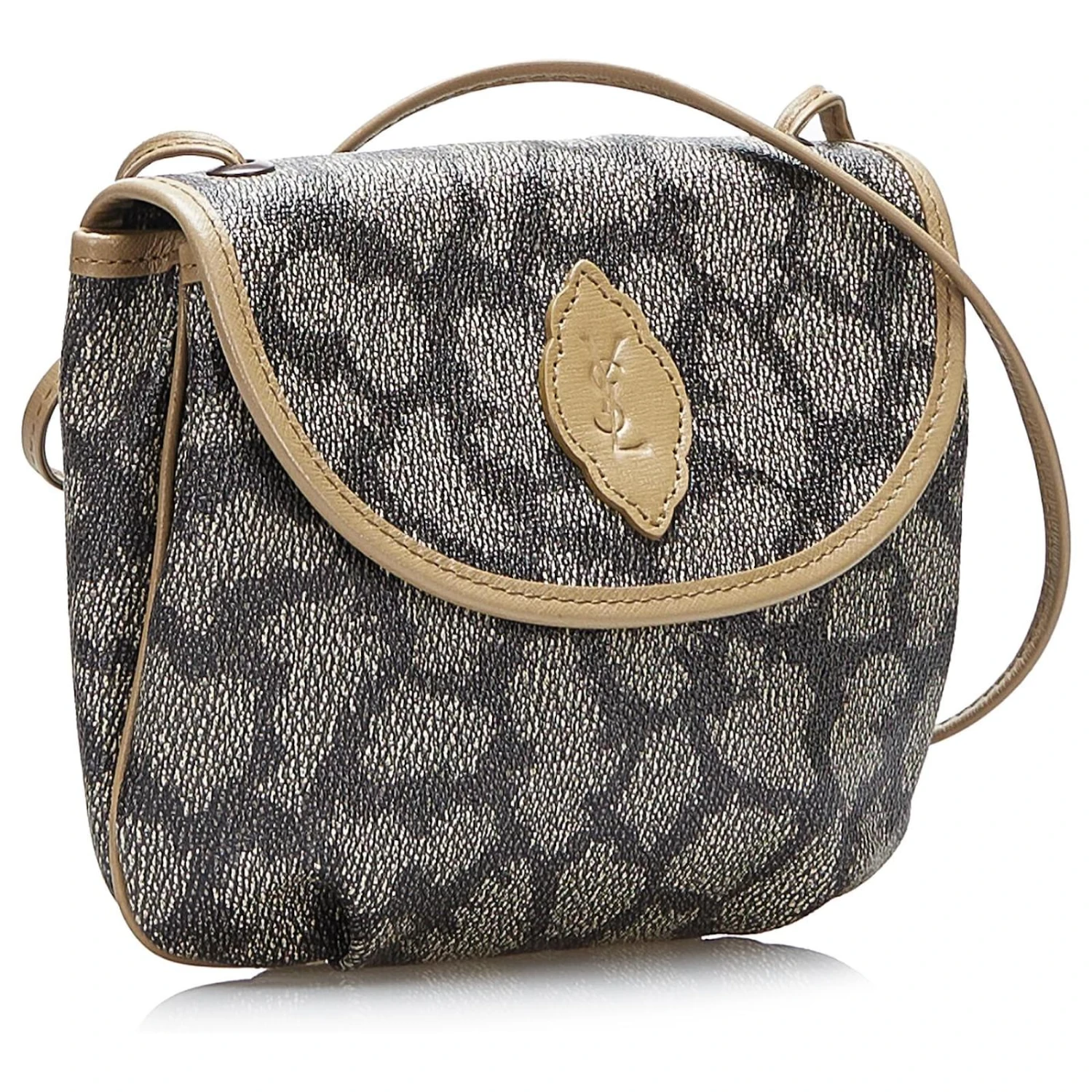 Ce sac à bandoulière en toile enduite imprimée avec une bordure en cuir, une bandoulière en cuir plat, rabat frontal à fermeture magnétique, et une poche intérieure zippée. Il porte une cote B + condition.