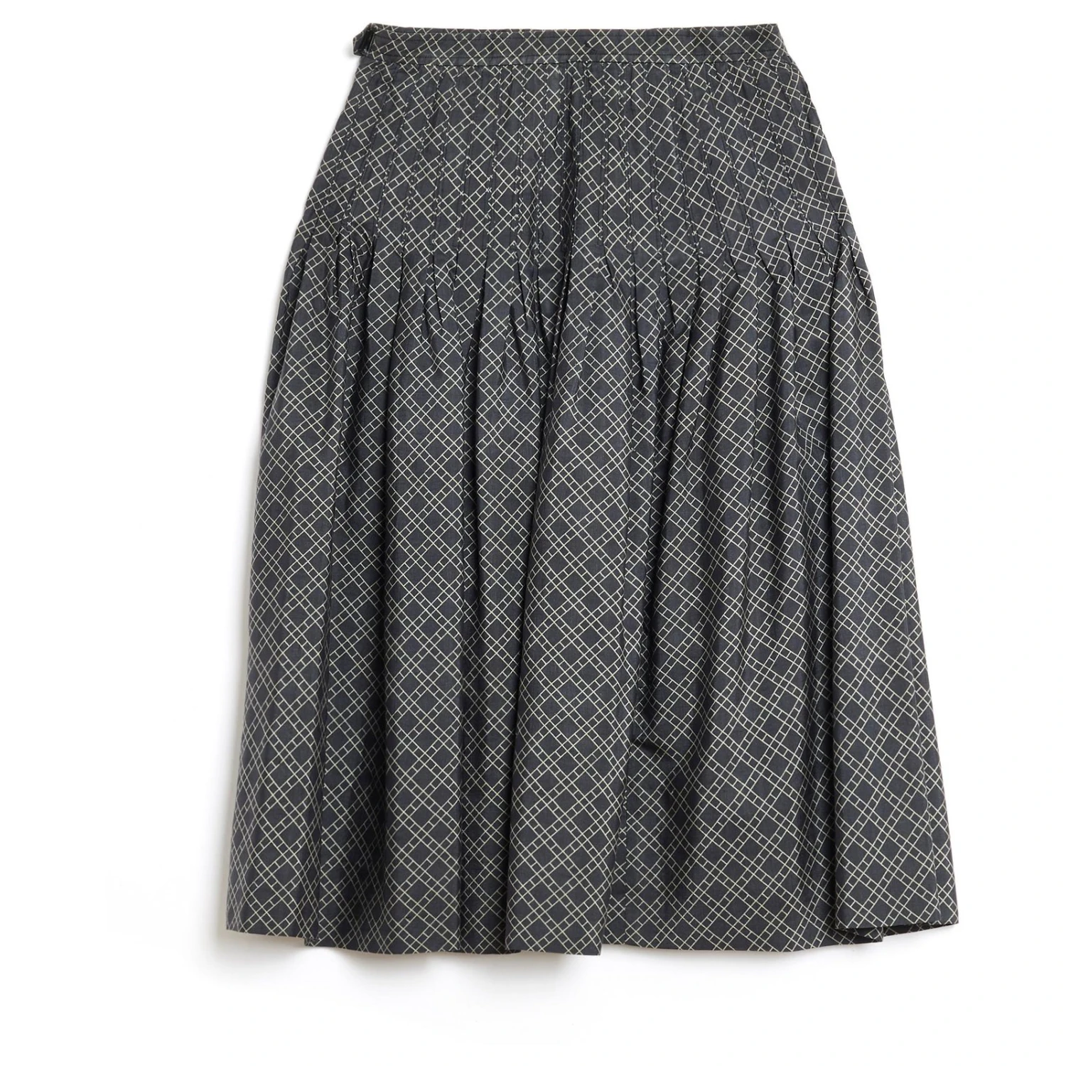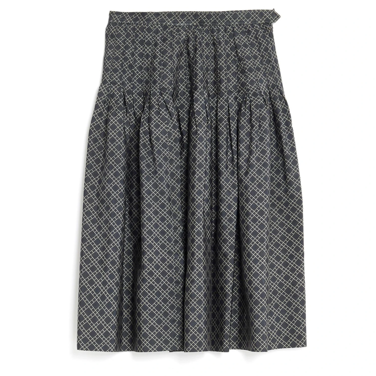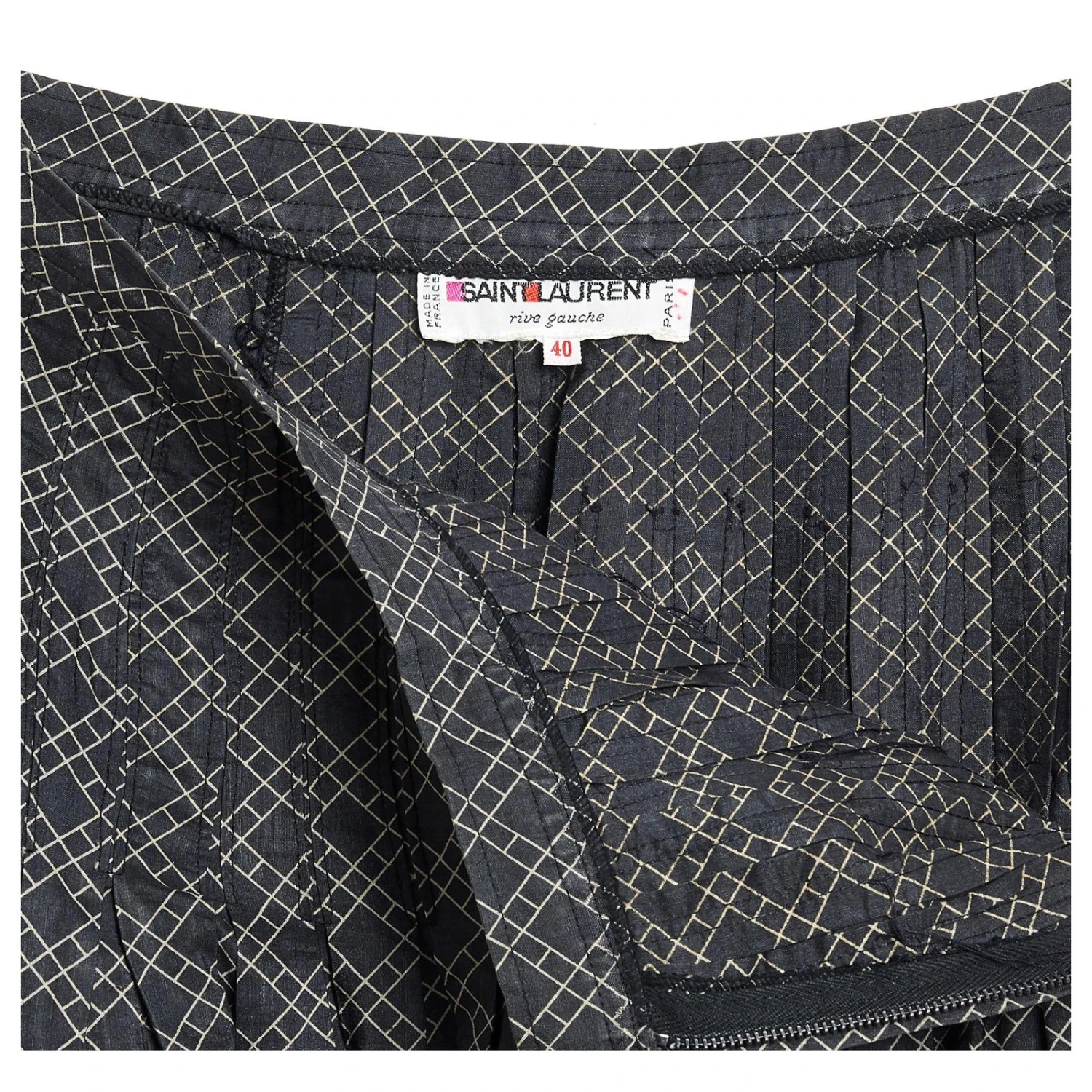 Jupe Yves Saint Laurent Rive Gauche en soie « craquante » gris foncé à fins carreaux écru beige, plissé piqué de la taille aux hanches, mi longue, non doublée, fermeture par un zip et un crochet. Taille 40 (!?) mais les mesures indique un 36FR selon Yves Saint Laurent : taille 34 cm, longueur 69 cm. La jupe est tout simplement magnifique portée, version champêtre ou soirée, bijoux et sandales argent.