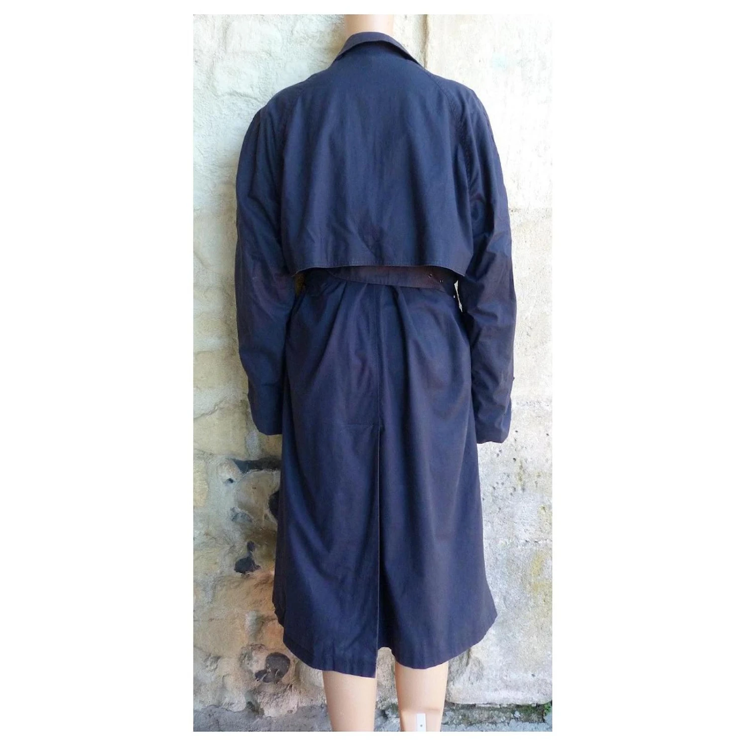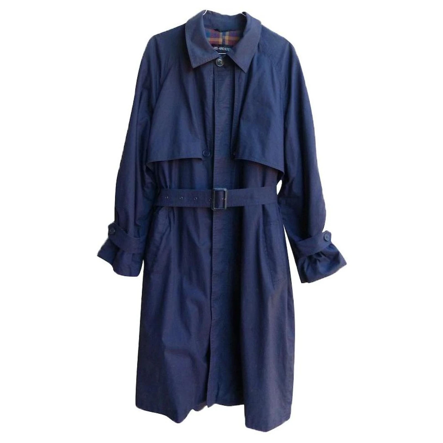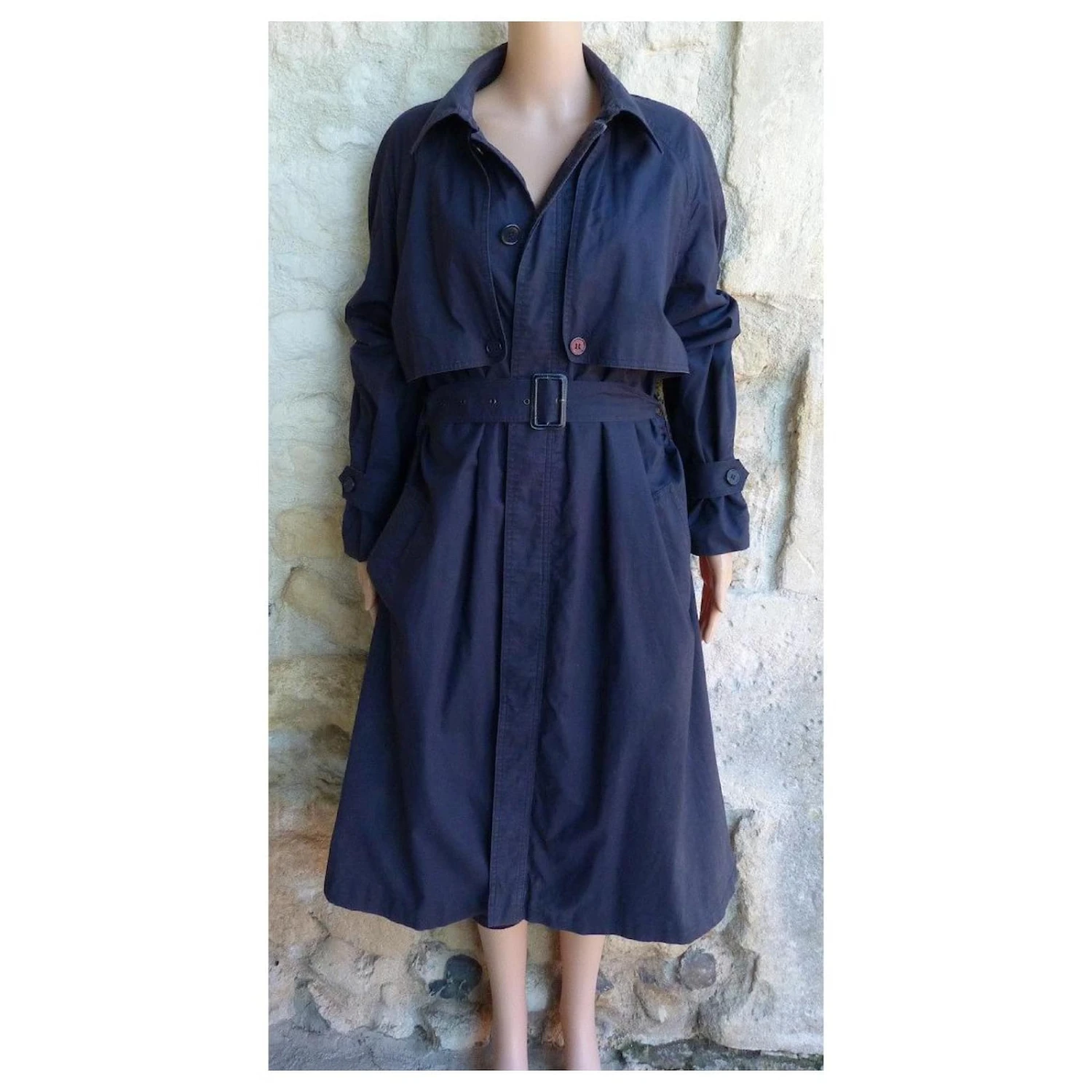 trench coat de la marque YVES SAINT LAURENT ! matière coton couleur bleu marine – intérieur doublure écossaise – ceinture d’origine amovible – 2 poches coté – fermeture par boutonnage invisible – 2 positions de resserage au bouts des manches