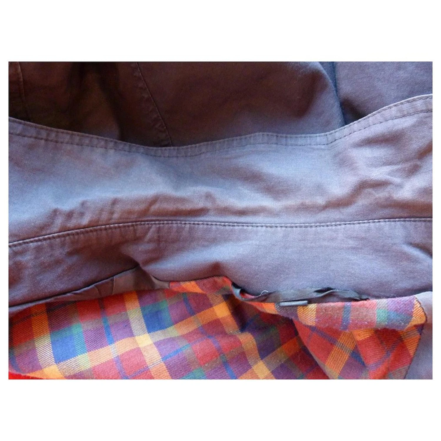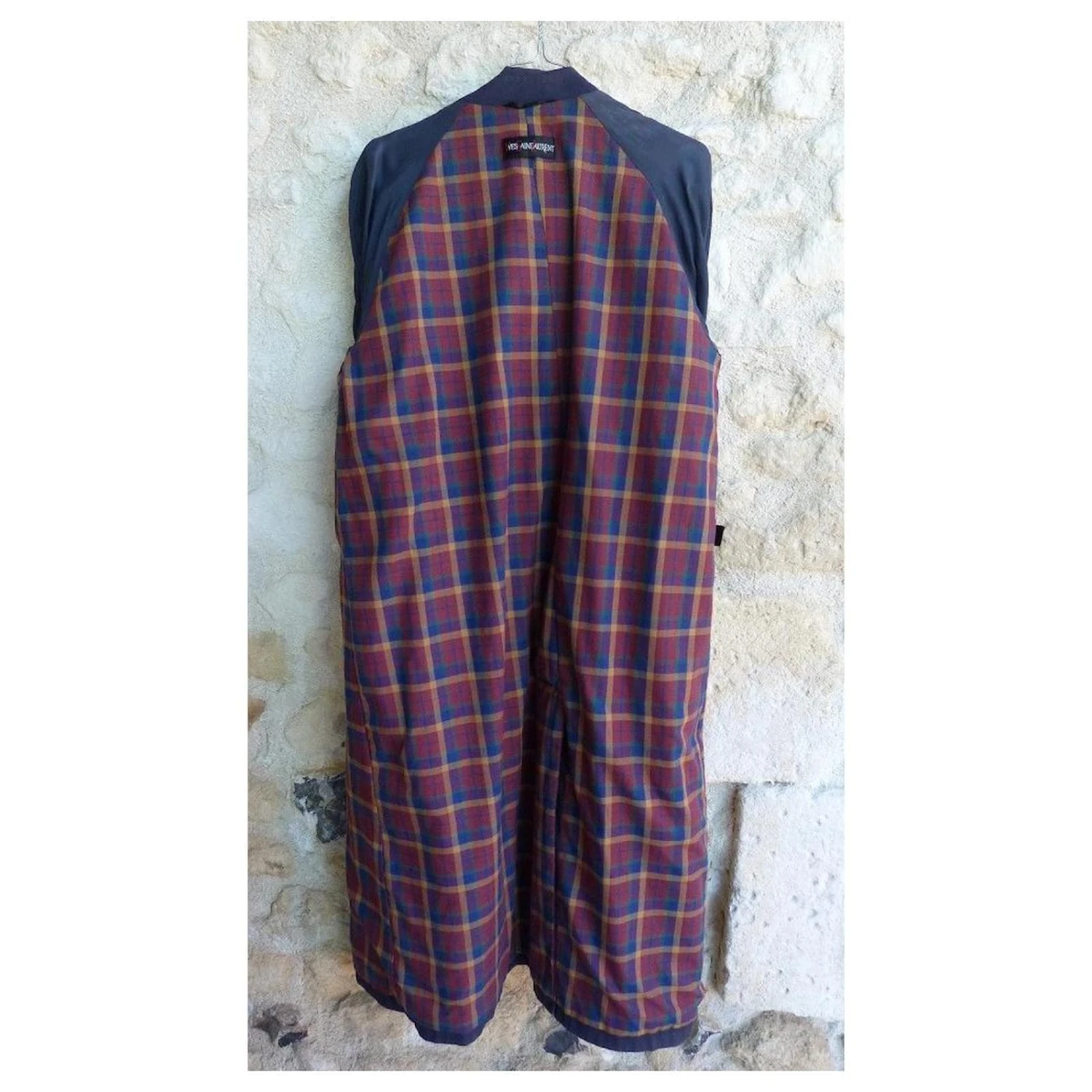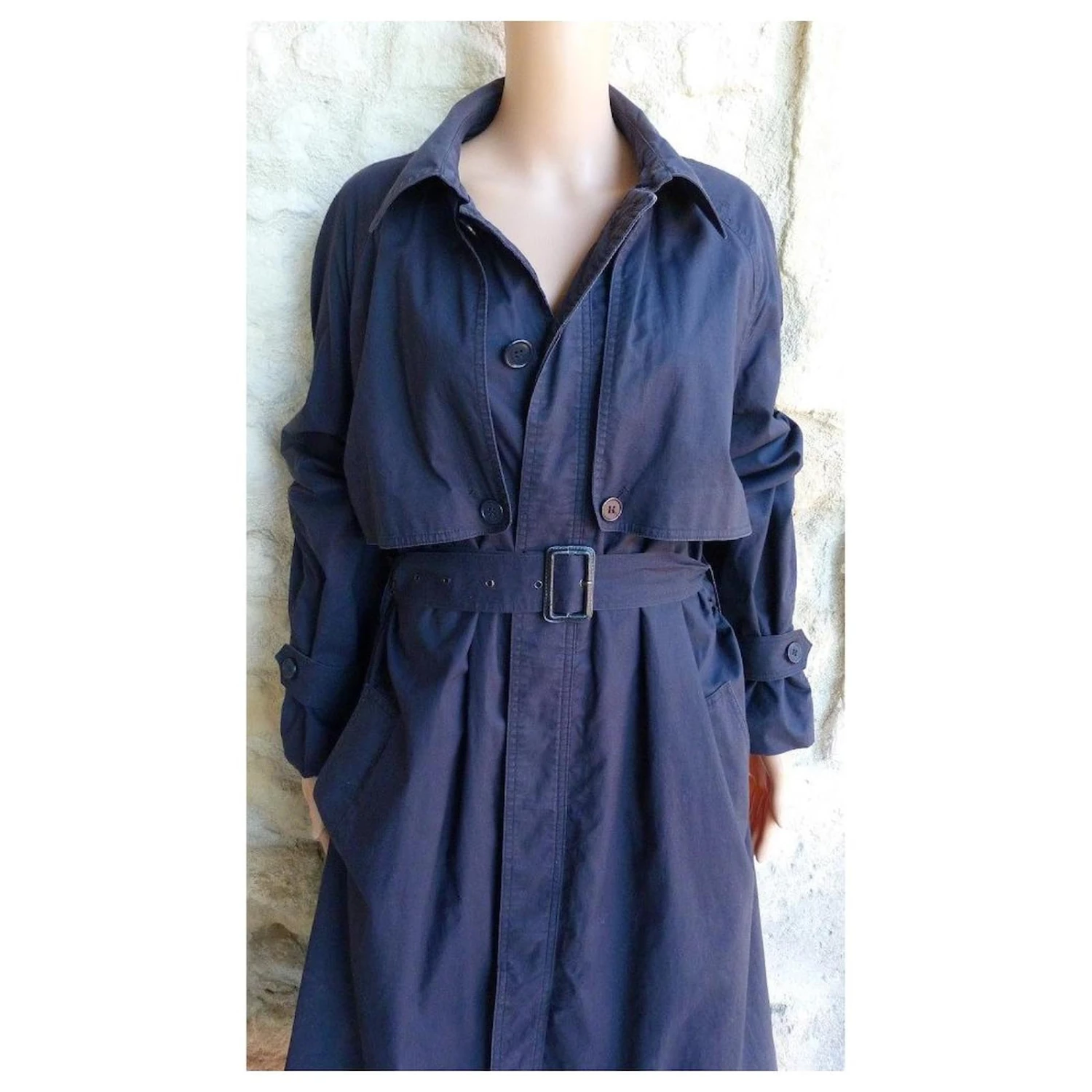 trench coat de la marque YVES SAINT LAURENT ! matière coton couleur bleu marine – intérieur doublure écossaise – ceinture d’origine amovible – 2 poches coté – fermeture par boutonnage invisible – 2 positions de resserage au bouts des manches