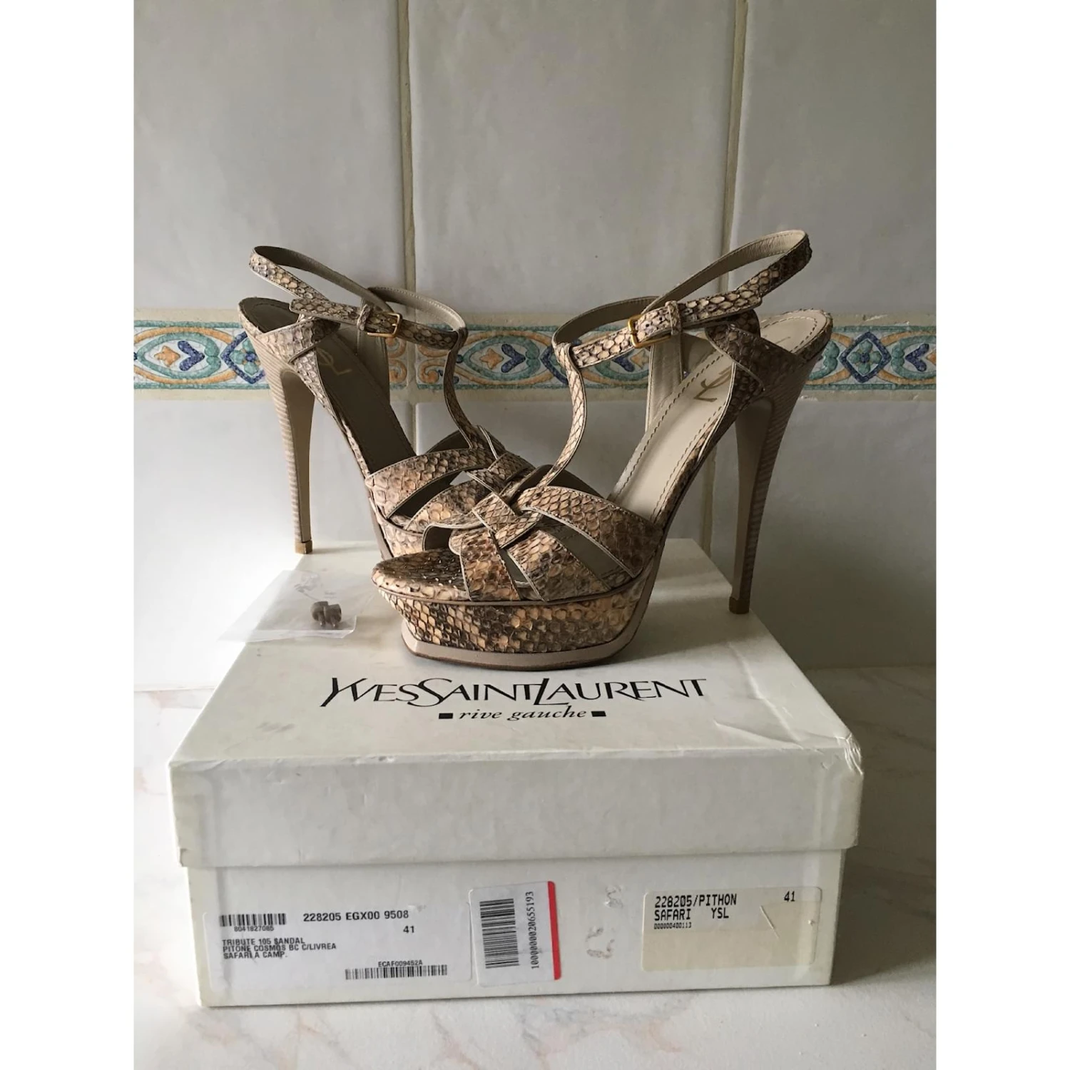 Magnifique paire de Sandales Tribute 105 Python portées une fois, ressemelées pour pas les abîmer. Pointure 41chausses petit, conviennent a un 40. La semelle intérieur mesure 27cm, hauteur du talon: 15, plateau: 4cm.