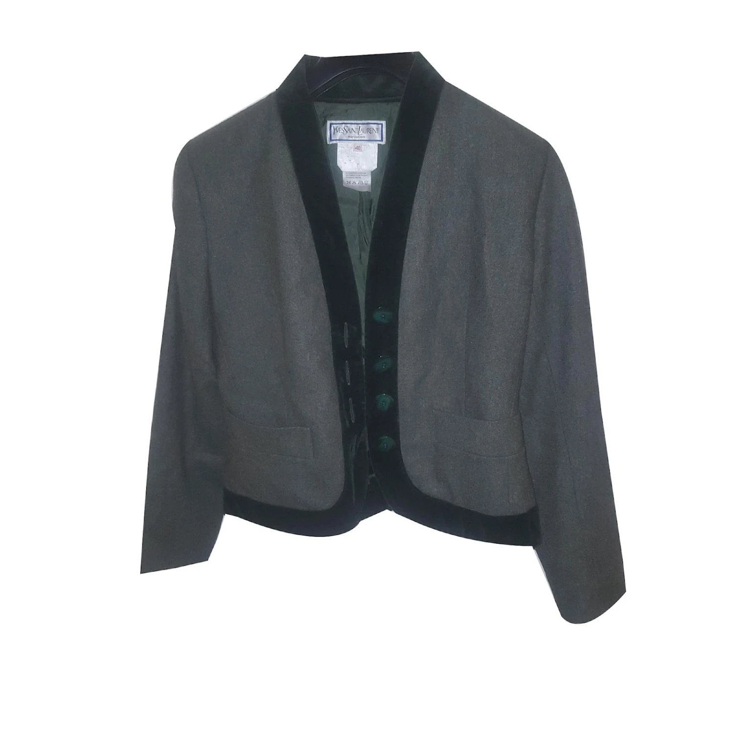Vintage ysl 100% pur laine veste et pantalon jacky taille 40 et pantalon en taille 38. Il a été porté parfaitement pour quelqu’un qui était de taille 10 uk. Les bords de style latéral bouton vert . Excellent état