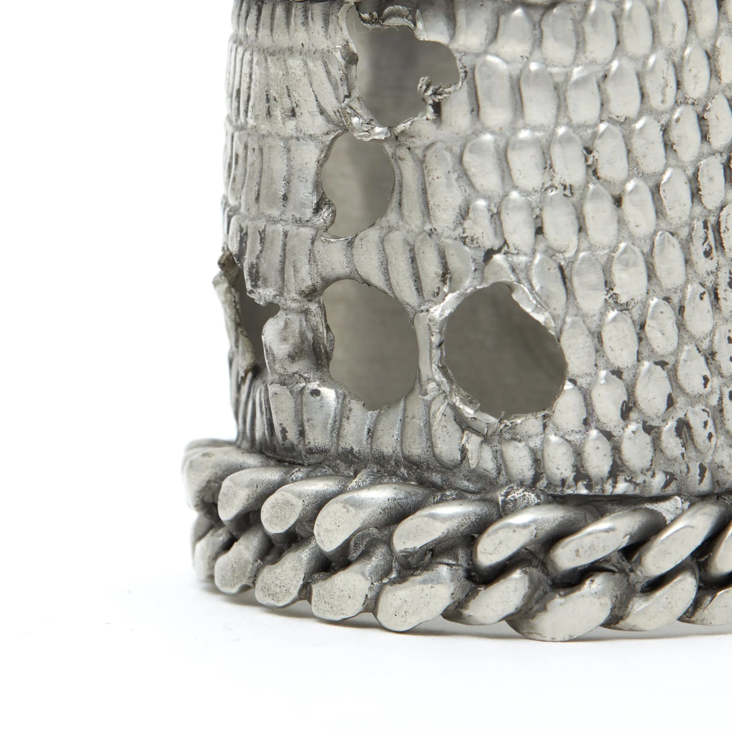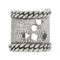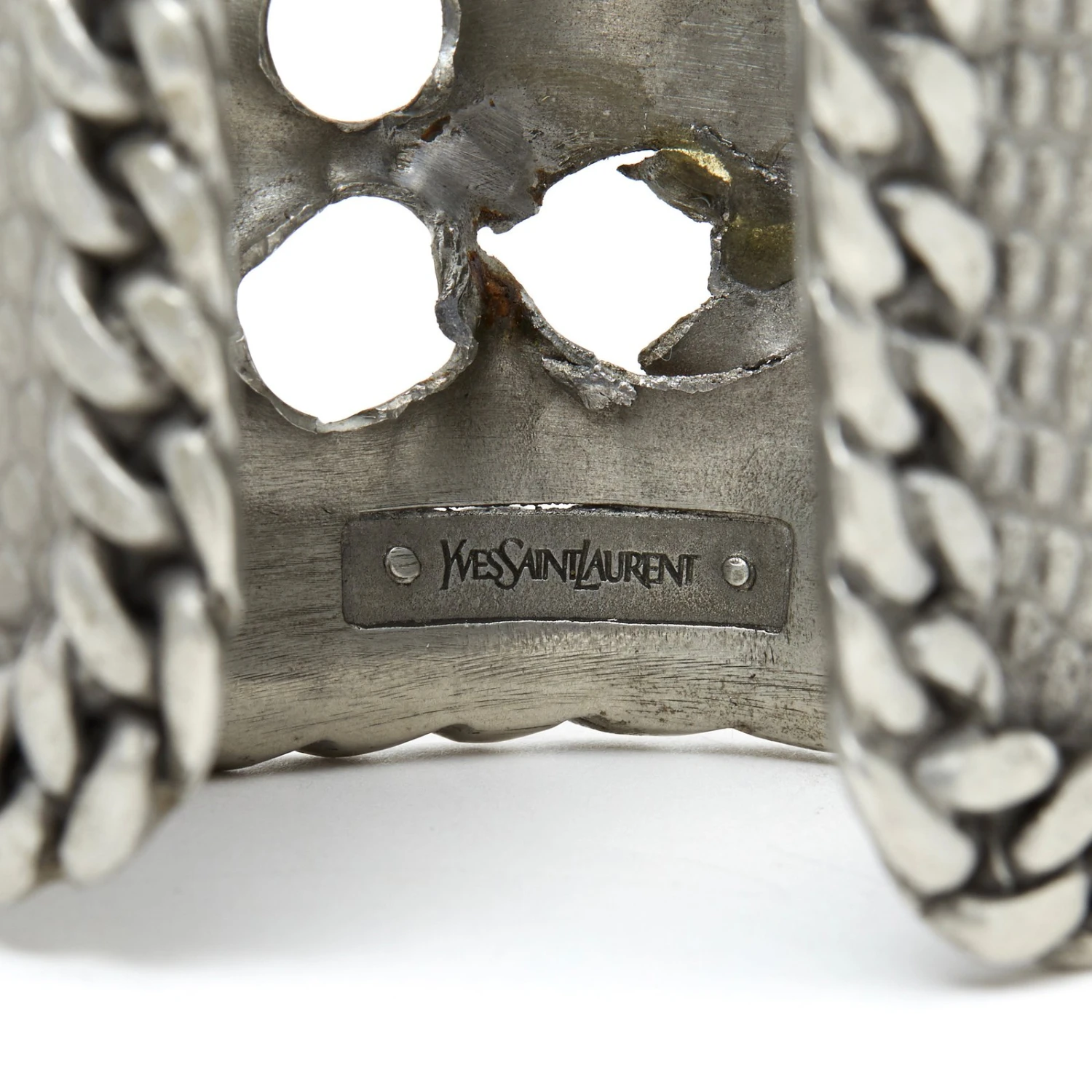 Manchette Yves Saint Laurent ouverte en métal argenté au motif d’une peau de reptile percée d’impact de balle et bordé de large maille gourmette. Pas de taille, la manchette est réglable en tirant (délicatement) sur le métal. Largeur 6,2 cm. Le bracelet est probablement unique (prototype), il est signé, en très bon état et il est superbe porté.