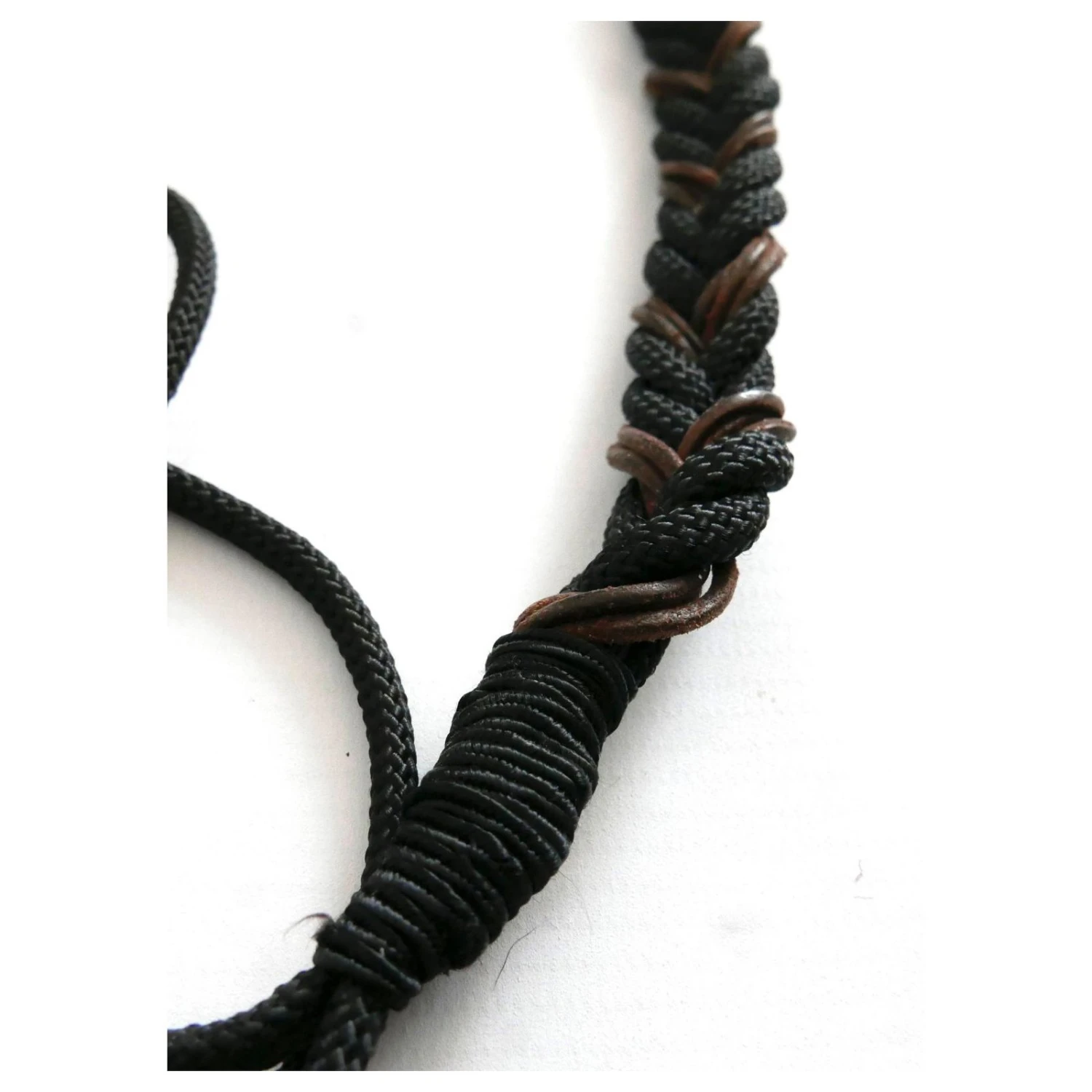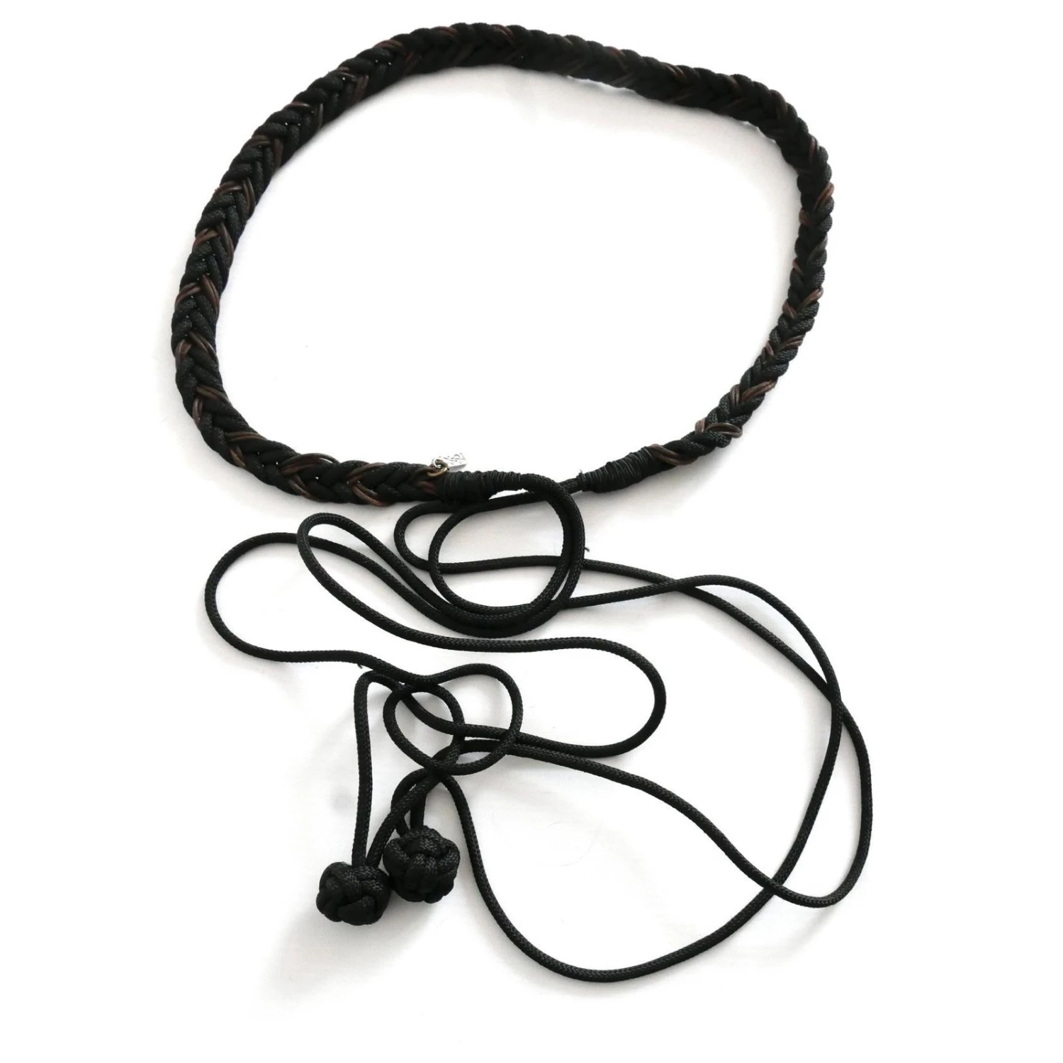 Fabriqué à partir de cordon tissé noir, tressé ou tressé avec une fine lanière en cuir marron.