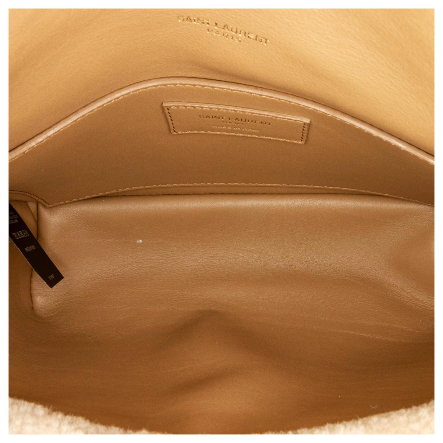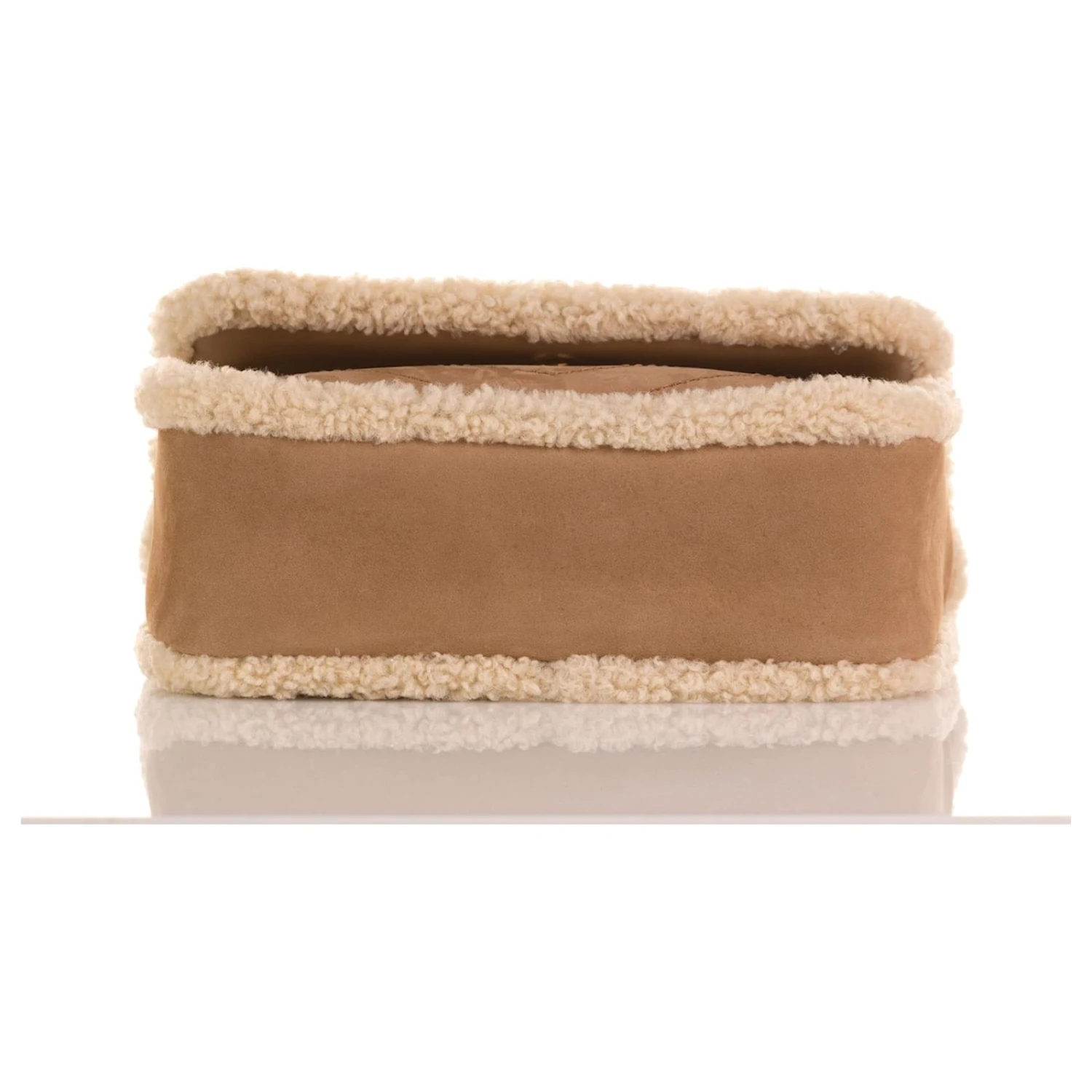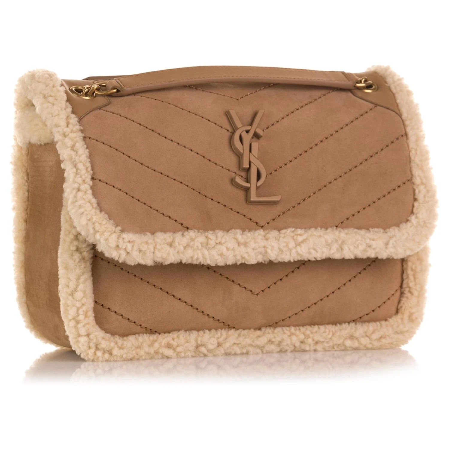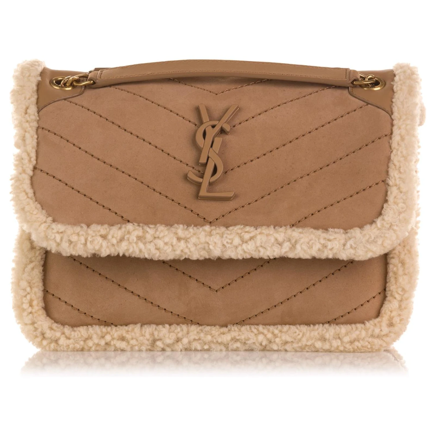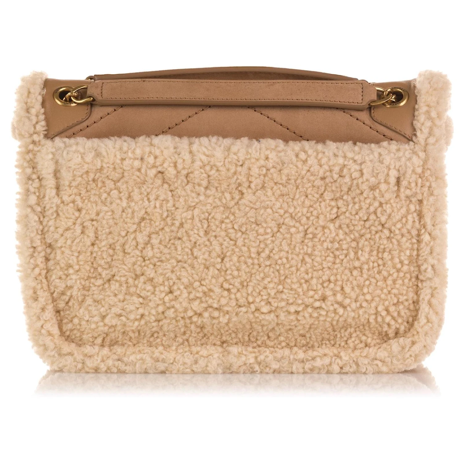 Le sac à bandoulière Niki en cuir suédé matelassé avec une bordure en mouton, une sangle gourmette, un rabat avant avec une fermeture magnétique, et une poche intérieure. Il porte une cote B + condition.